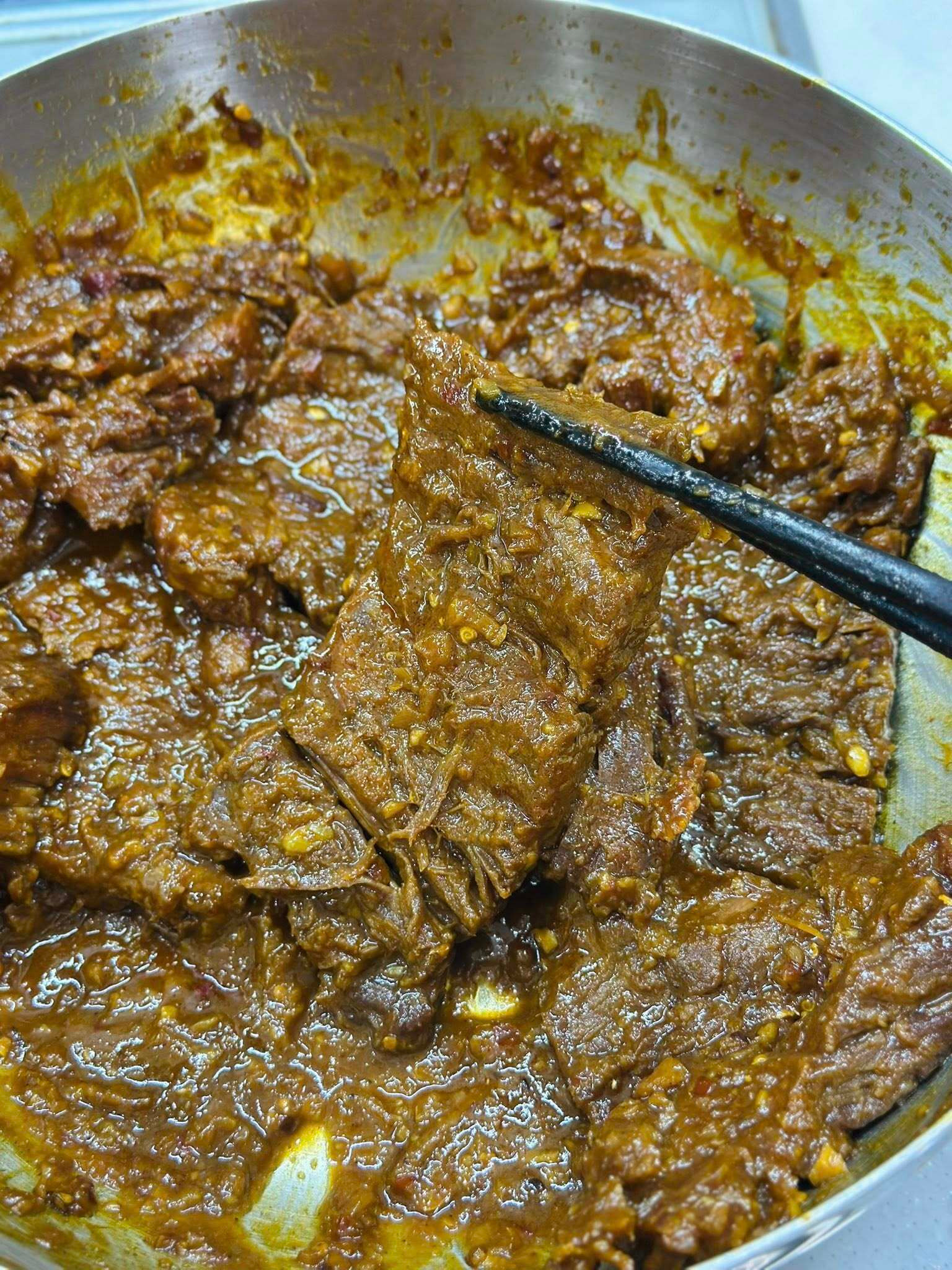 - Sên chảo: Cho toàn bộ bò đã ướp vào chảo, bật lửa nhỏ và sên đều tay. Khi sên, thịt sẽ dần săn lại, nước sốt sệt rồi khô dần. Cần đảo liên tục để thịt không bị cháy, đồng thời giúp hơi nước thoát ra từ từ, giữ được độ dai mềm.