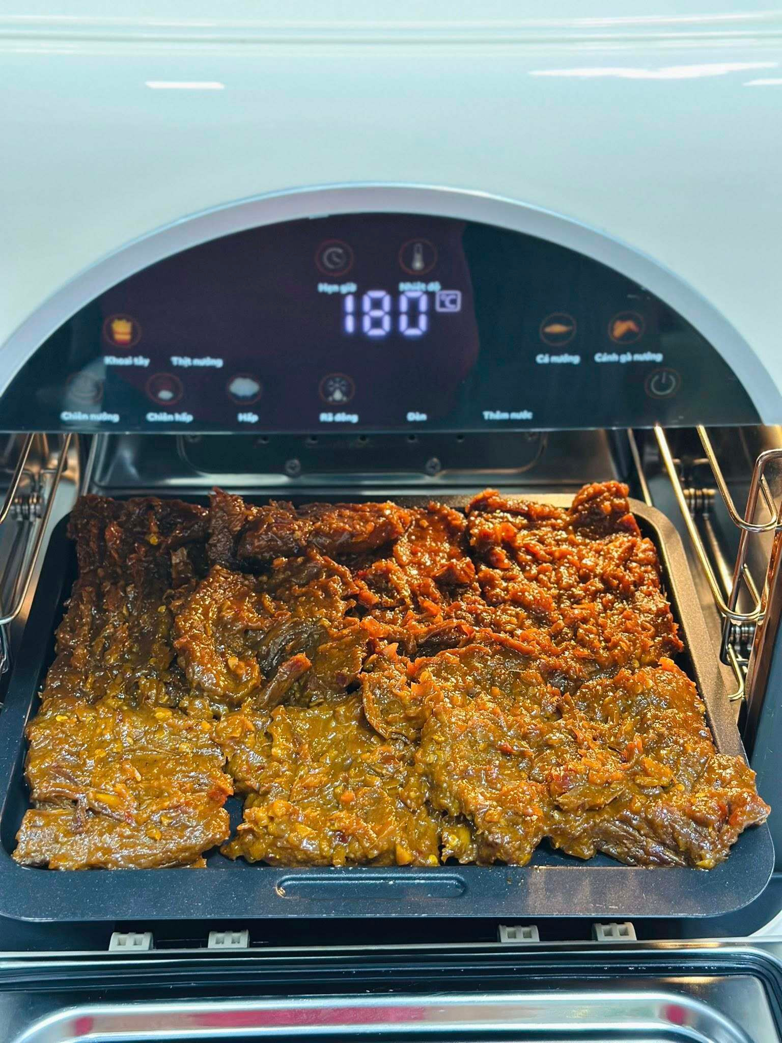 - Dùng nồi chiên hơi nước hoặc nồi chiên không dầu: Xếp các miếng bò vào khay, không chồng lên nhau để thịt khô đều. Cài đặt nhiệt độ khoảng 100–120°C trong 2 tiếng. Trong quá trình sấy, cứ khoảng 15 phút nên mở ra đảo một lần để các mặt thịt khô đều, tránh chỗ khô quá, chỗ còn ẩm.