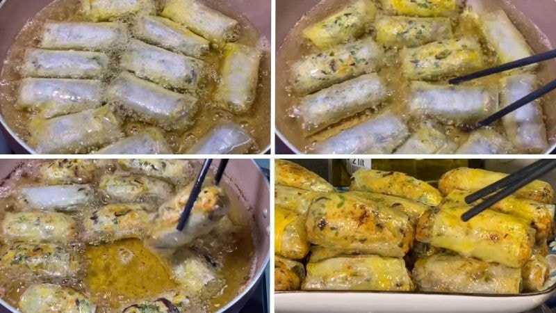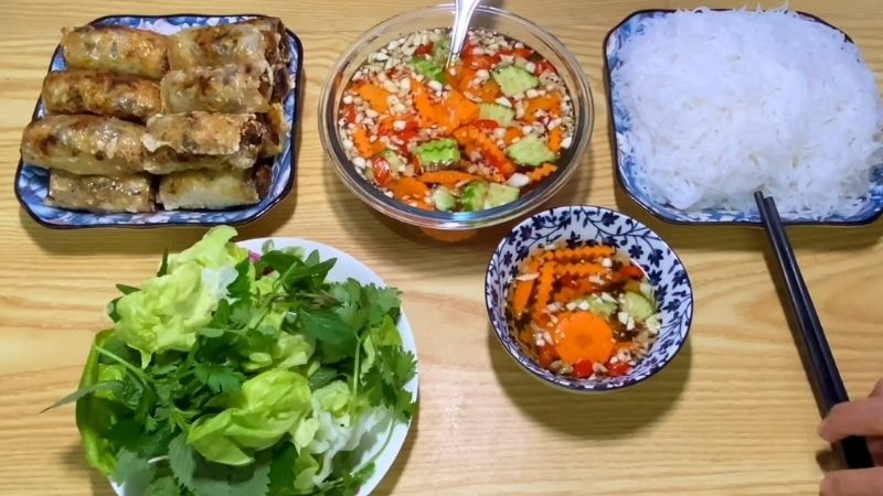 Trong khi chờ nem nguội, bạn có thể pha nước chấm theo tỷ lệ cơ bản: 1 phần đường, 1 phần mắm, 5 phần nước lọc. Khuấy đều cho đường tan hết rồi thêm giấm, tỏi, ớt băm và một chút tiêu. Khi nem đã nguội hoàn toàn, đun nóng già dầu ăn và cho nem vào chiên lại lần hai. Chiên đến khi nem có màu vàng nâu đẹp mắt và vỏ giòn rụm thì vớt ra, để ráo dầu.