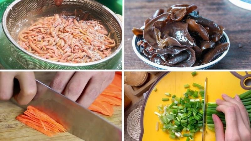 Rau củ: Mộc nhĩ, nấm hương, miến, giá đỗ, cà rốt, hành lá, hành tây (hoặc hành khô)