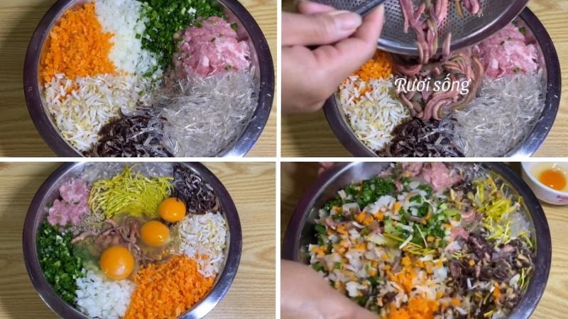 Cho tất cả nguyên liệu đã sơ chế gồm thịt xay, hành lá, hành tây, cà rốt, giá đỗ, nấm hương, mộc nhĩ, miến, rươi, vỏ quýt và hạt tiêu vào một tô lớn. Đập 3 quả trứng gà vào, sau đó trộn thật đều tay để các nguyên liệu hòa quyện và tạo thành một hỗn hợp có độ kết dính tốt.