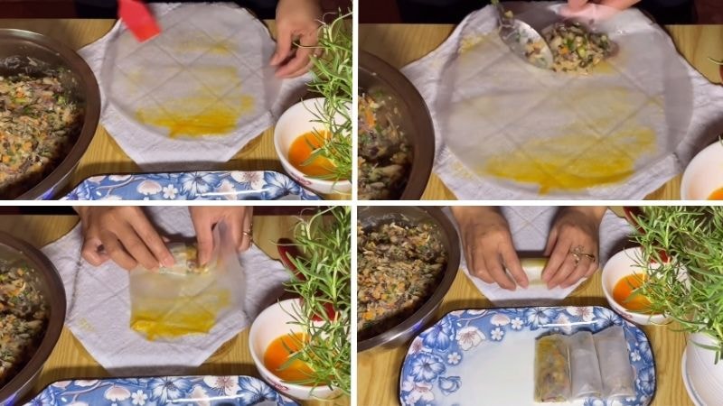 Trải bánh đa nem lên một mặt phẳng sạch. Để bánh mềm và dễ gói, bạn có thể dùng khăn ẩm lau nhẹ qua. Quét một lớp lòng đỏ trứng gà mỏng lên bề mặt bánh để tăng độ kết dính và giúp nem có màu vàng đẹp khi chiên. Múc một lượng nhân vừa đủ vào, cuộn một vòng, gấp hai mép bên lại rồi cuộn tròn cho đến hết.