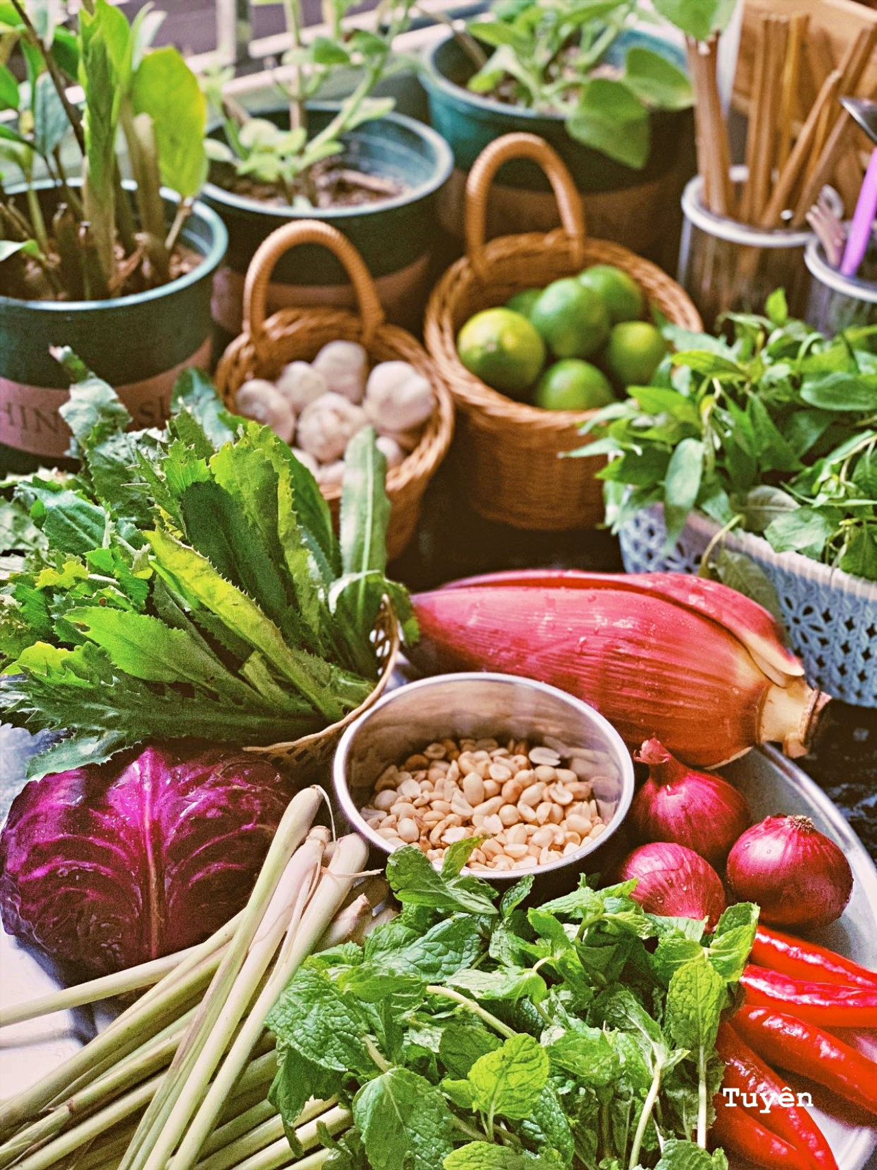- Chắt nước đi, nêm nếm lại rồi cho lạc, vừng, rau sống vào là hoàn thành món nộm hoa chuối thanh mát.