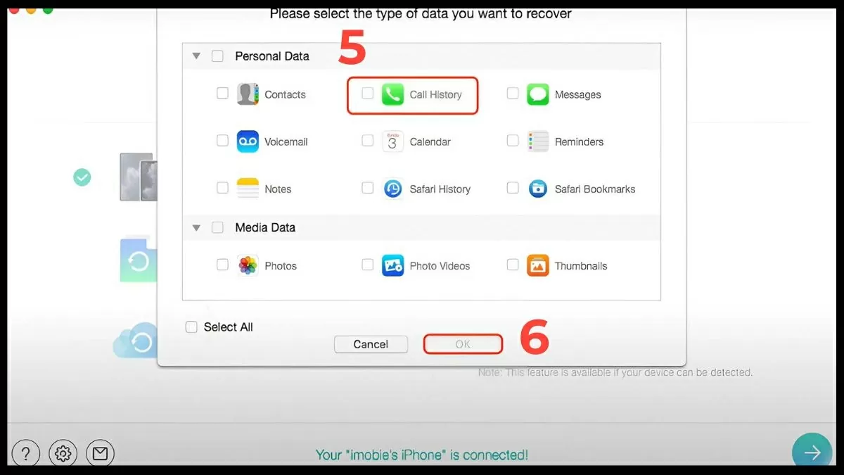 Sau khi quét xong, chọn Call History, nhấn OK và chờ phần mềm khôi phục nhật ký cuộc gọi đã xóa về iPhone của bạn.