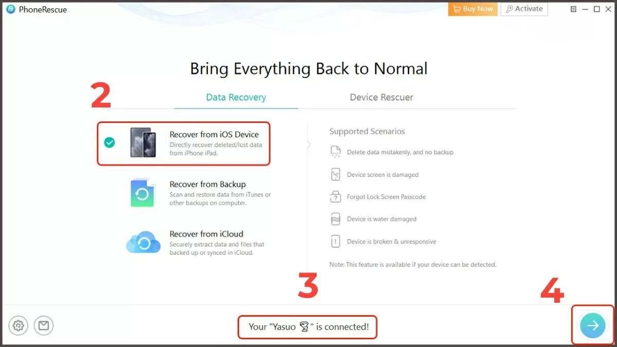 Chọn Recover from iOS Device để PhoneRescue quét toàn bộ dữ liệu trên thiết bị. Nhấn nút mũi tên để chuyển sang bước tiếp theo.