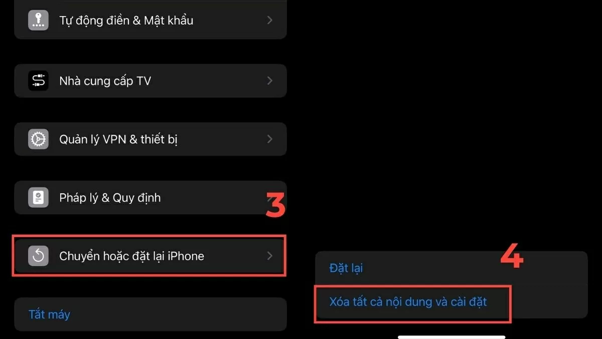 Mở Cài đặt (Settings) chọn Cài đặt chung (General) kéo xuống chọn Chuyển hoặc đặt lại iPhone (Transfer or Reset iPhone) nhấn Xóa tất cả nội dung và cài đặt (Erase All Content and Settings).