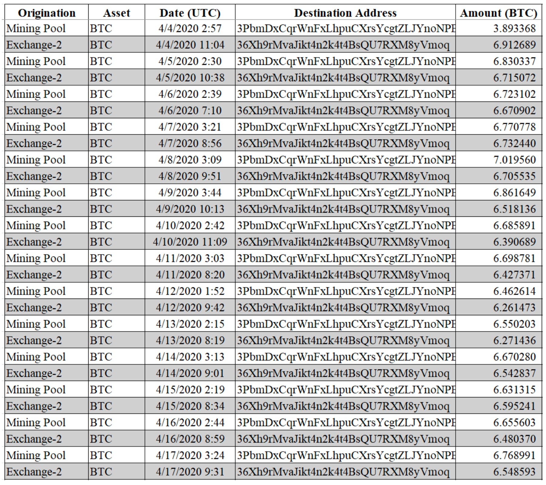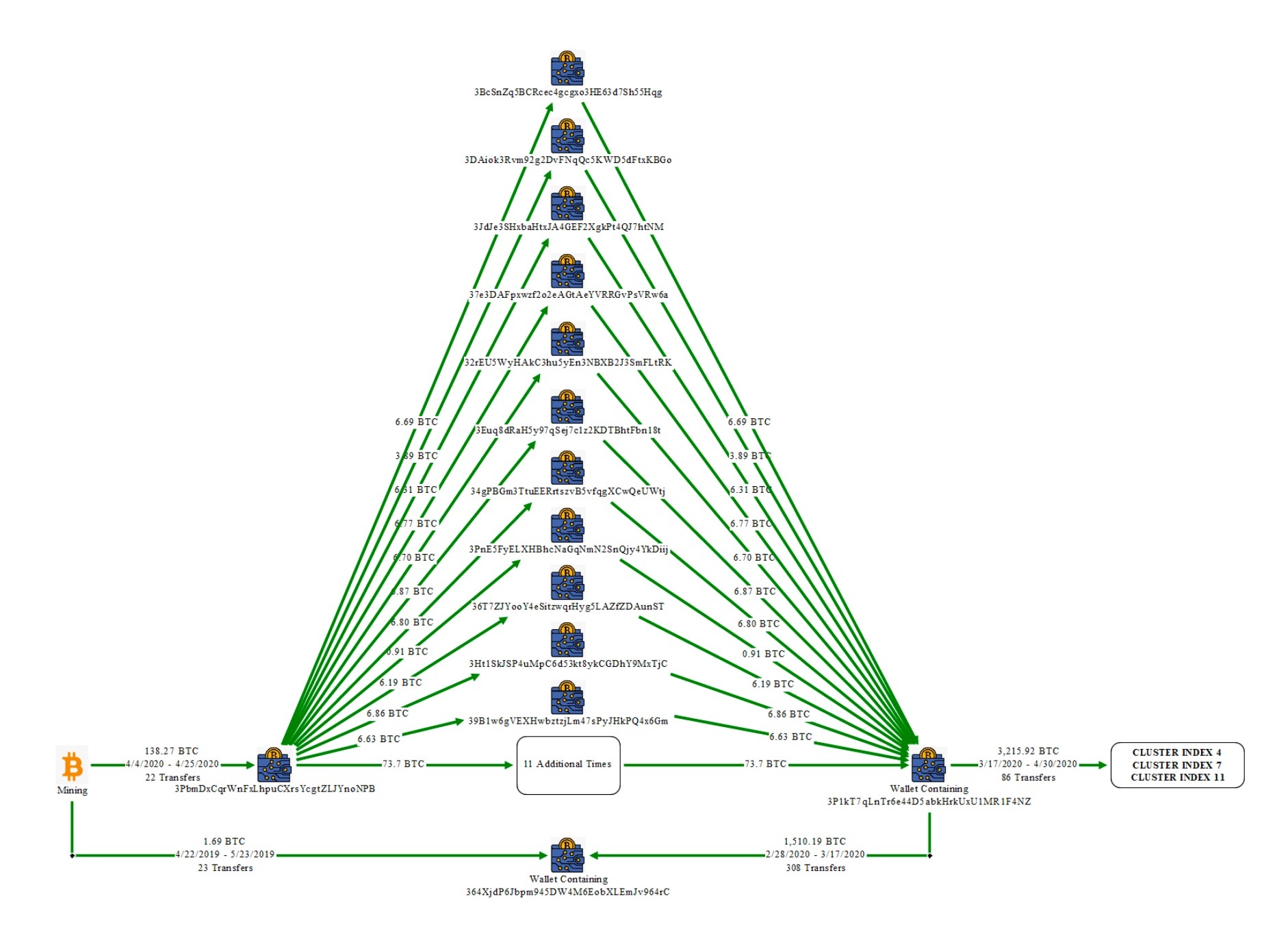 Đáng chú ý khi các giao dịch được gửi với số lượng và thời gian gần giống nhau. Sự tương đồng cho thấy Bitcoin từ Exchange-2 (tiền lừa đảo) được chuyển có chủ đích để bắt chước giao dịch từ quỹ khai thác Bitcoin, tạo vỏ bọc rằng toàn bộ số tiền trong ví có nguồn gốc từ hoạt động khai thác thông thường, che giấu nguồn tiền phi pháp còn lại.