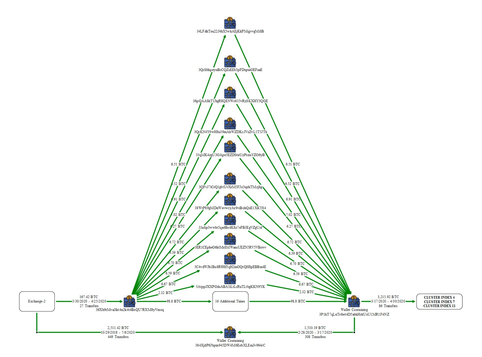 Tương tự, tiền từ Exchange-2 được chia thành 27 địa chỉ rồi gộp vào địa chỉ khác, tạo thành mô hình giao dịch phức tạp.
