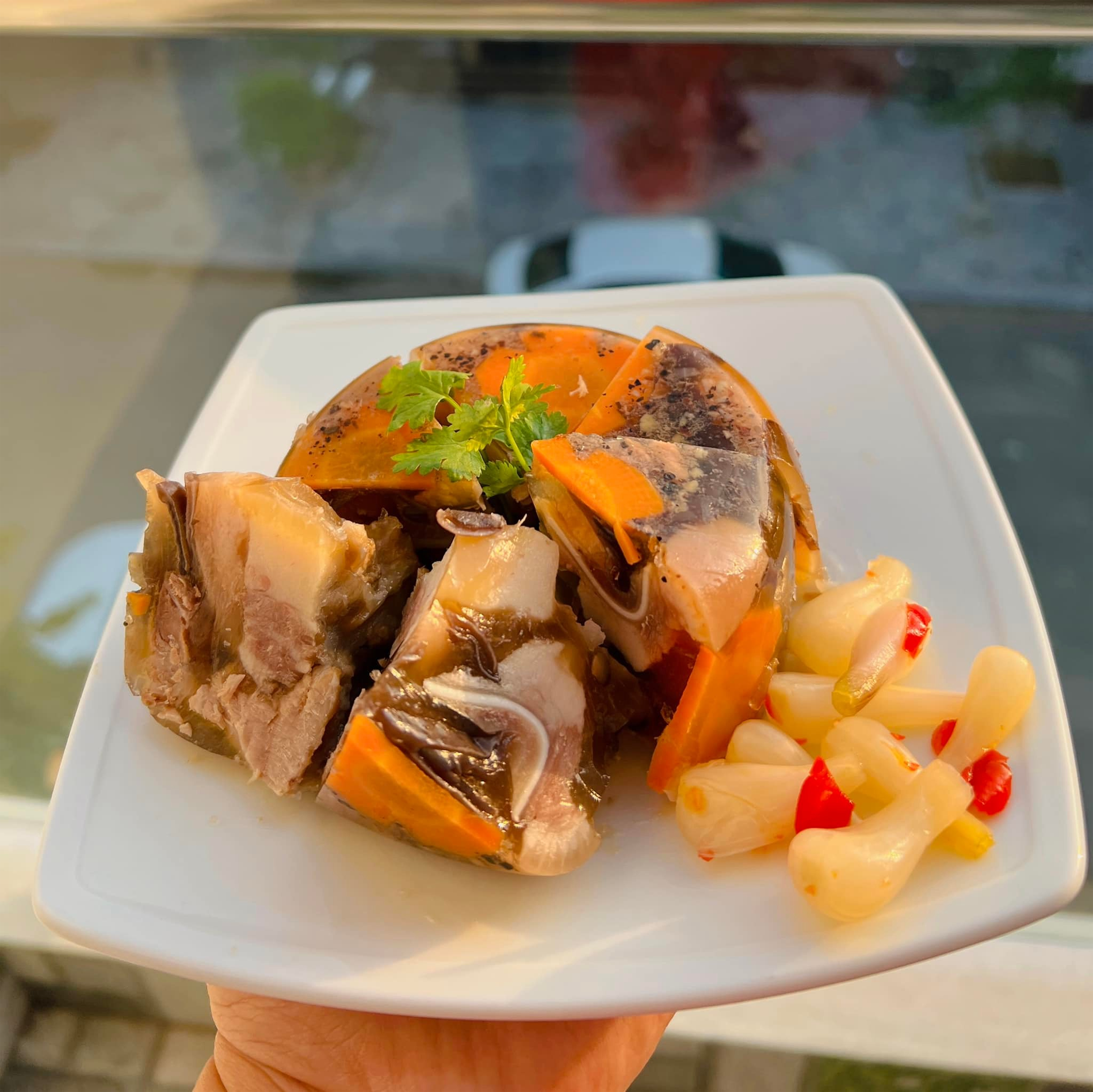 Khi ăn, bạn lấy thịt đông ra, xắn thành từng miếng lớn rồi chia nhỏ, ăn kèm dưa hoặc hành muối đều ngon, giúp giải ngấy.