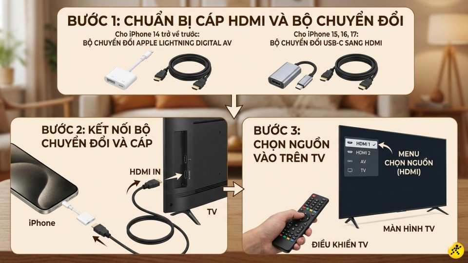 Bước 1: Chuẩn bị sợi cáp HDMI và bộ chuyển đổi (Adapter). Đối với iPhone 14 trở về trước, dùng cổng Lightning; đối với iPhone 15, 16, 17, dùng cổng USB-C.