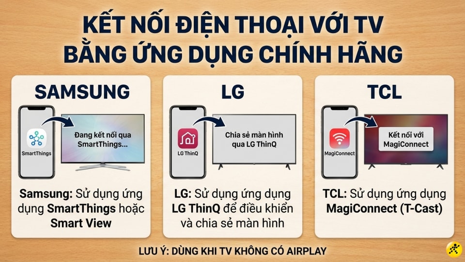 Nếu tivi của bạn không hỗ trợ sẵn AirPlay, bạn có thể sử dụng các ứng dụng chuyên dụng từ nhà sản xuất hoặc ứng dụng trung gian: