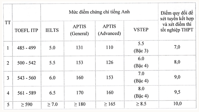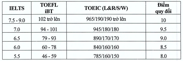 Nhà trường cũng công bố bảng quy đổi điểm chứng chỉ quốc tế, trong đó IELTS 5.5 tương đương 8 điểm; 6.0 tương đương 8,5 điểm; 6.5 tương đương 9 điểm; 7.0 tương đương 9,5 điểm và từ 7.5 đến 9.0 tương đương 10 điểm.