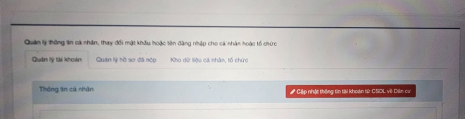 Sau khi đăng nhập thành công, nhấn vào tên tài khoản của bạn ở góc trên bên phải màn hình. Chọn mục "Thông tin cá nhân". Tại đây, tìm và nhấn vào nút "Cập nhật thông tin tài khoản từ CSDL về dân cư".