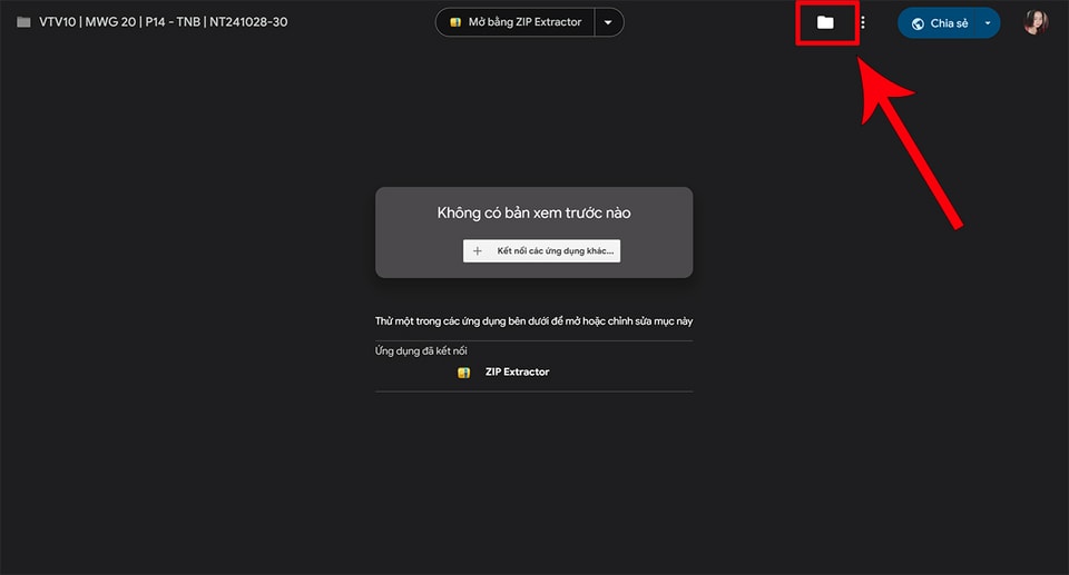 Khi mở liên kết Google Drive, bạn sẽ thấy màn hình hiển thị thông báo "Không có bản xem trước". Tại đây, hãy nhấn vào biểu tượng thư mục có dấu cộng ở góc trên bên phải để "Thêm lối tắt vào Drive".