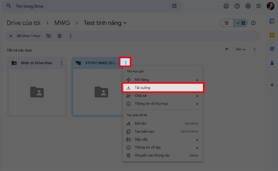 Mở tài khoản Google Drive của bạn và truy cập vào thư mục đã chọn ở bước 2. Bạn sẽ thấy lối tắt của tệp vừa thêm. Nhấn vào biểu tượng ba chấm bên cạnh tệp hoặc thư mục đó và chọn "Tải xuống".