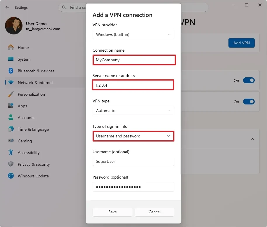 Trong cửa sổ cấu hình, tại mục VPN provider, hãy chọn Windows (built-in). Tiếp theo, bạn nhập tên gợi nhớ cho kết nối và điền địa chỉ IP hoặc tên miền của máy chủ từ xa vào ô Server name or address.