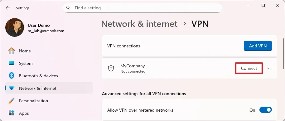 Cách 1: Truy cập Settings > Network & internet > VPN. Chọn tên mạng đã tạo và nhấn Connect (Kết nối).