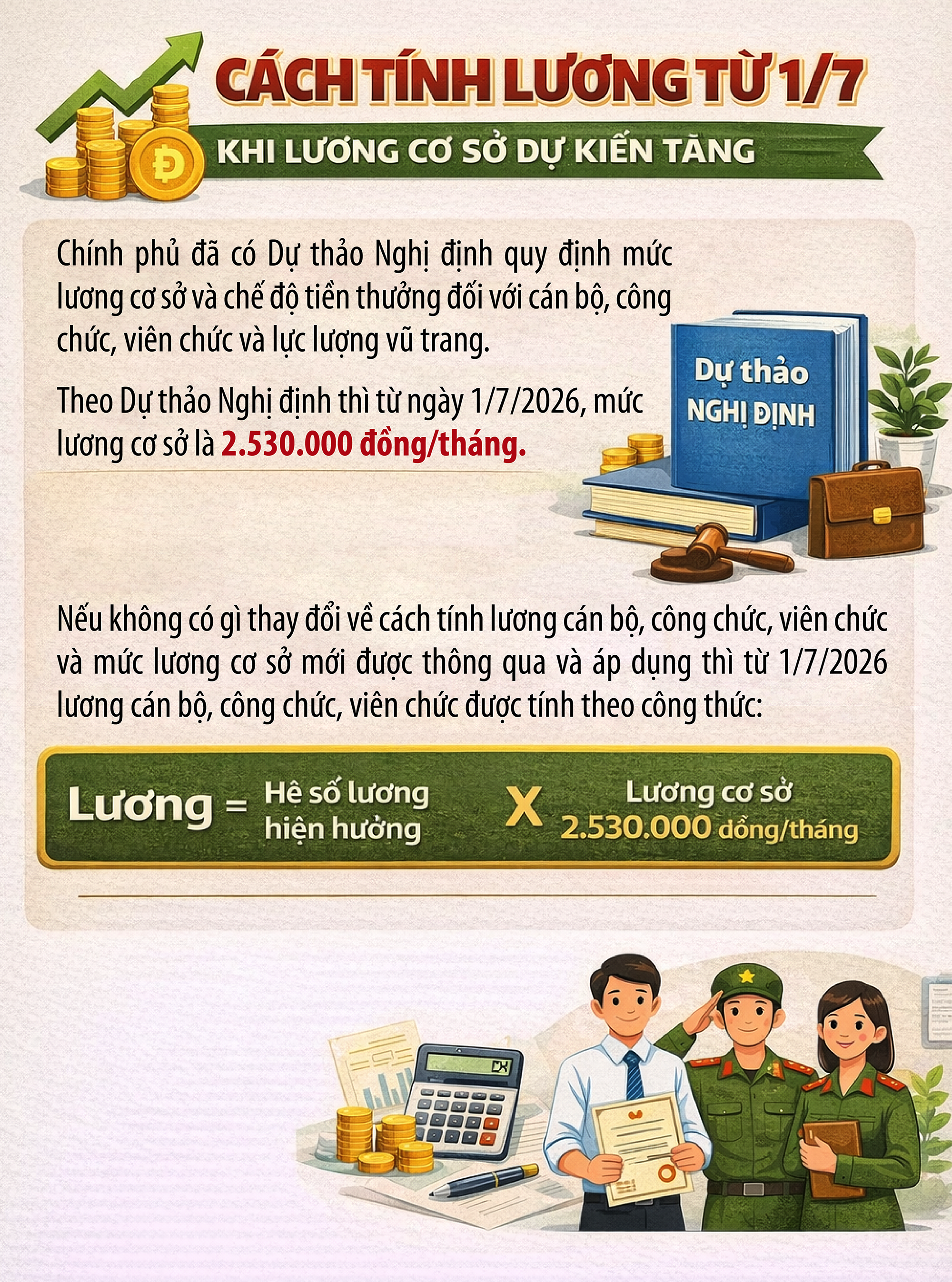 Hiện nay, lương cán bộ, công chức, viên chức được tính theo công thức quy định tại Thông tư 07/2024/TT-BNV:
