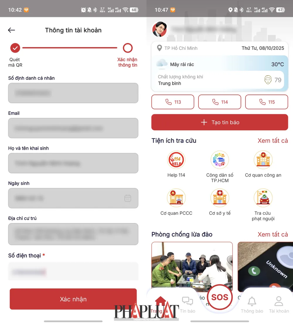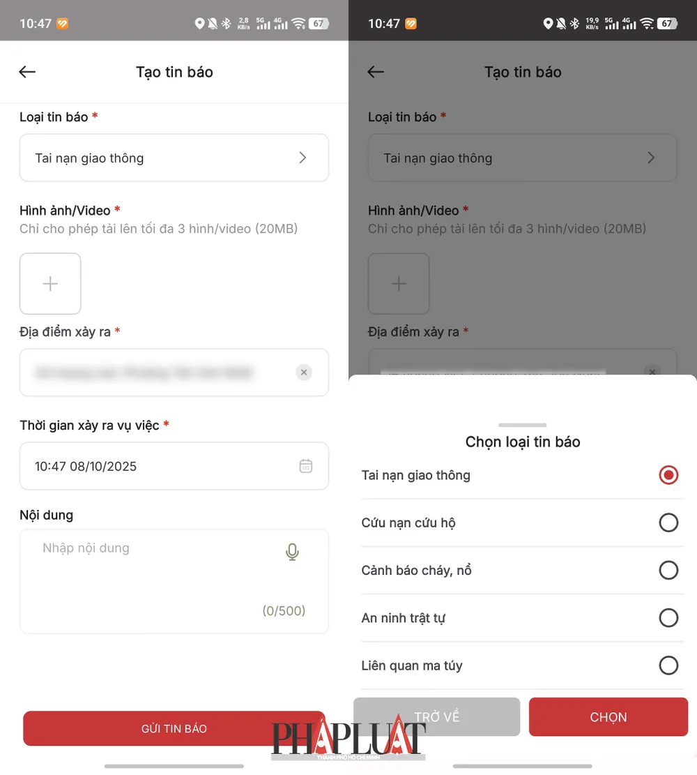 Cách báo cáo tai nạn giao thông, tố giác tội phạm trên ứng dụng SOS An ninh trật tự. Ảnh: MINH HOÀNG