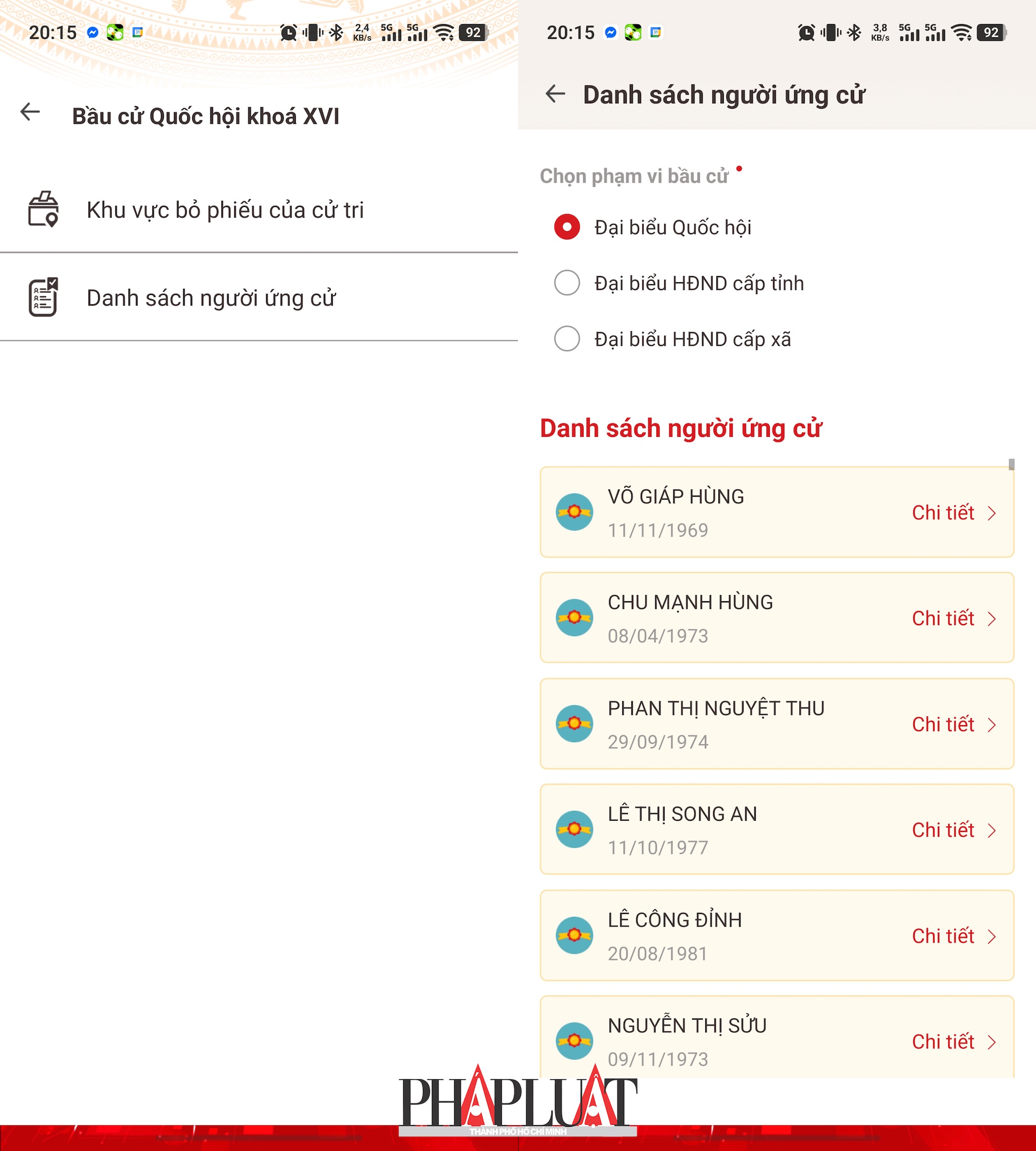 Ở đây sẽ có hai phần gồm Khu vực bỏ phiếu của cử tri và Danh sách người ứng cử. Nếu muốn xem thông tin của những người ứng cử Đại biểu Quốc hội, Đại biểu HĐND cấp tỉnh hoặc Đại biểu HĐND cấp xã, người dùng chỉ cần bấm vào mục Danh sách người ứng cử.