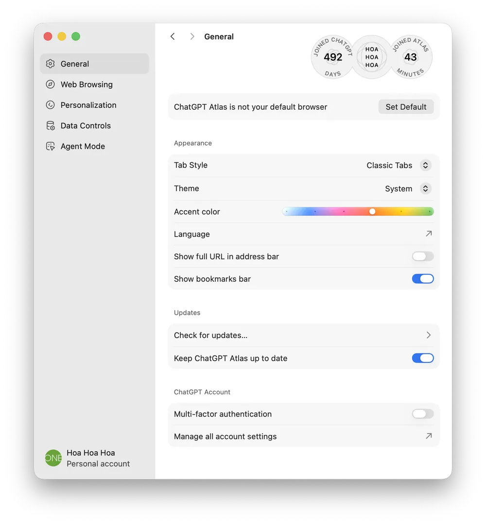 Khi cài đặt và đăng nhập tài khoản ChatGPT, Atlas có thể nhập toàn bộ bookmark và lịch sử lướt web từ trình duyệt Chrome hoặc Safari.