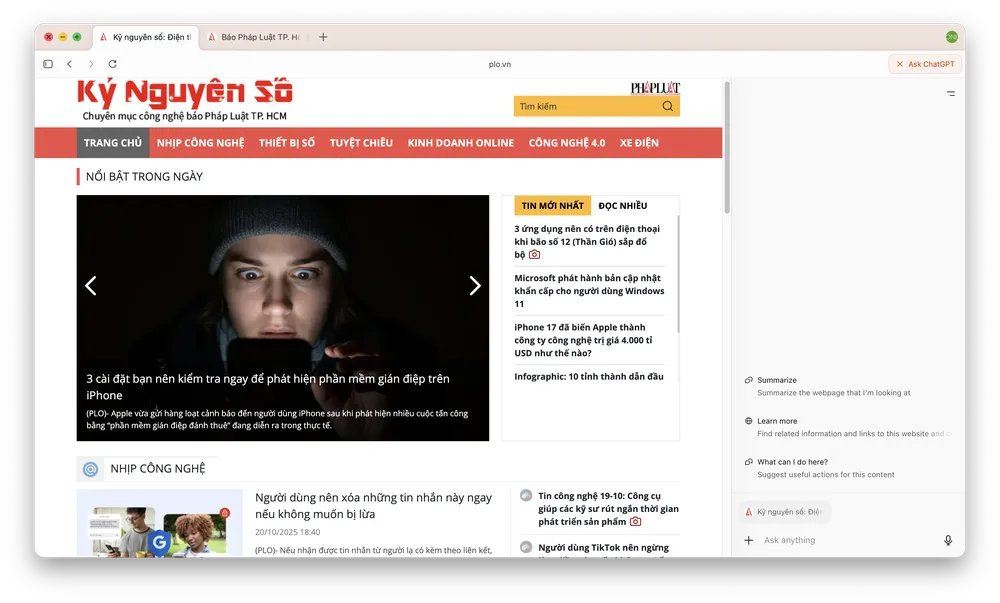 So với các trình duyệt khác, ChatGPT Atlas có khả năng hiểu ngữ cảnh, nội dung trang mà bạn đang mở. Để sử dụng, người dùng chỉ cần nhấp vào tùy chọn Ask ChatGPT ở góc phải, tại đây, bạn có thể yêu cầu AI tóm tắt bài viết, giải thích thuật ngữ, trích số liệu hoặc viết lại một đoạn văn theo phong cách khác mà không cần rời trang.
