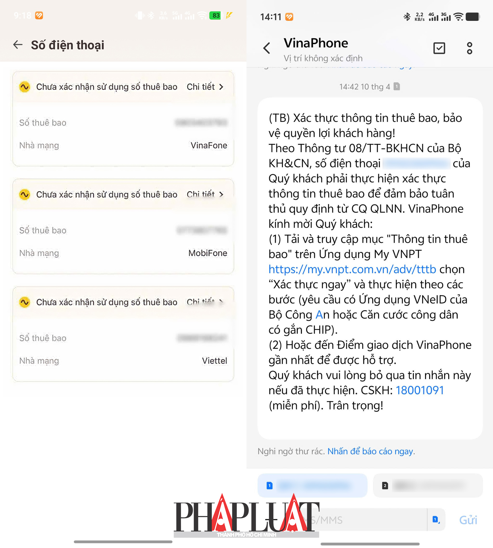 Ngoài ra, nếu nhận được tin nhắn từ nhà mạng yêu cầu xác thực thông tin thuê bao, bạn chỉ cần làm theo hướng dẫn để bổ sung giấy tờ tương ứng. Việc này có thể thực hiện tại nhà thông qua các ứng dụng của nhà mạng, VNeID hoặc đến trực tiếp các điểm giao dịch để được hỗ trợ.