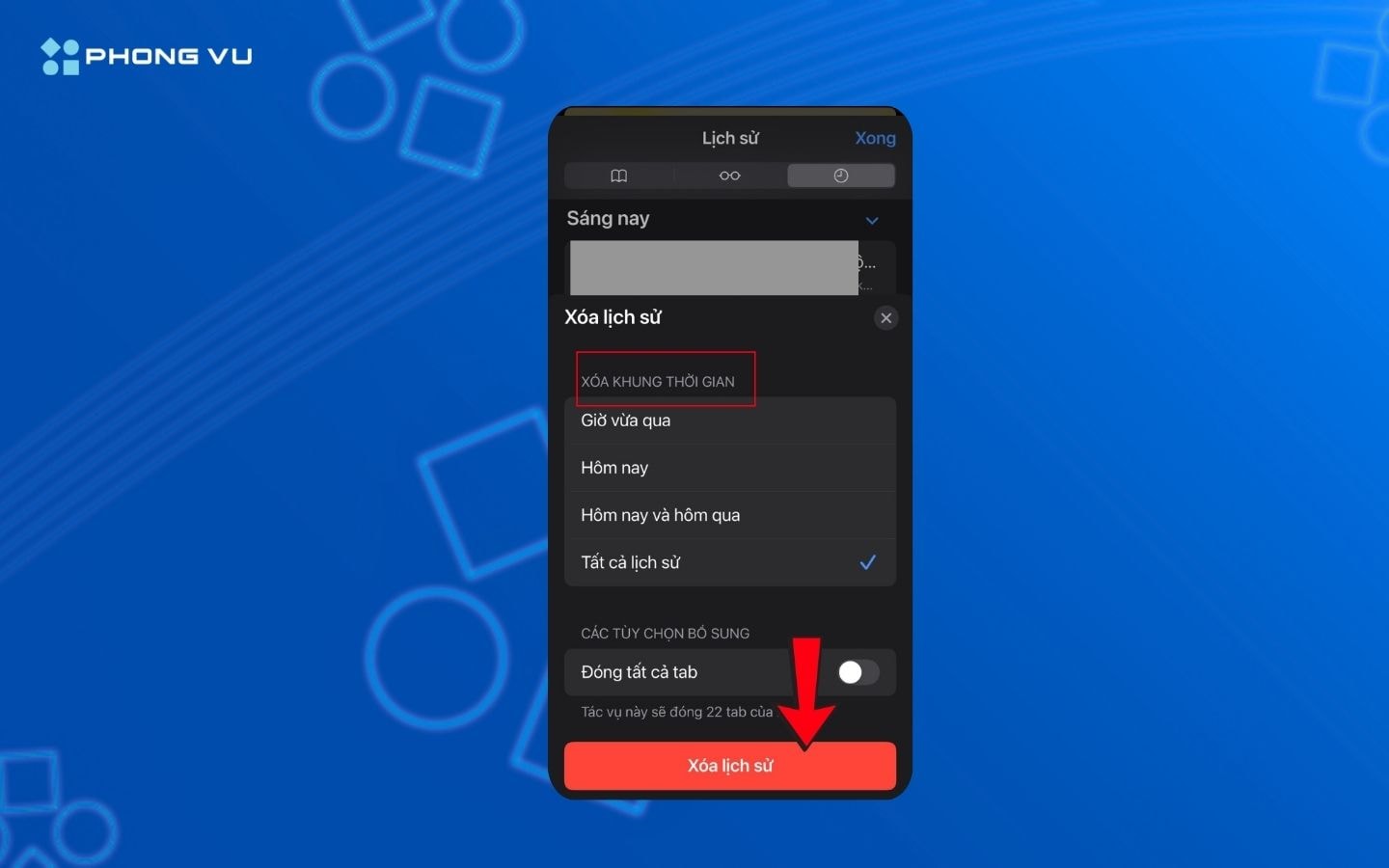 Bước 2: Chuyển sang tab Lịch sử (biểu tượng đồng hồ). Tại đây, bạn có thể vuốt để xóa từng tab hoặc chọn Xóa để lọc theo mốc thời gian: Giờ vừa qua, Hôm nay, Hôm nay và hôm qua hoặc Tất cả lịch sử.