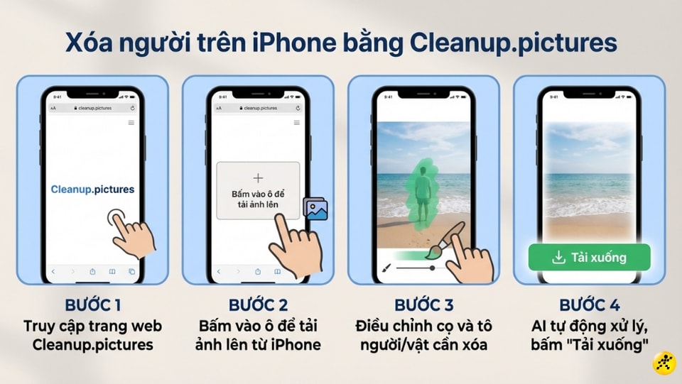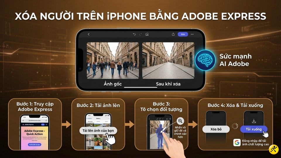 Nếu không muốn tải ứng dụng, các website AI như Cleanup.pictures, Adobe Express hay Fotor là lựa chọn thay thế tuyệt vời. Người dùng chỉ cần truy cập qua Safari, tải ảnh lên và dùng cọ tô vào vùng cần xóa. Adobe Express đặc biệt mạnh mẽ trong việc tái tạo nền chân thực nhờ công nghệ từ Adobe Firefly.