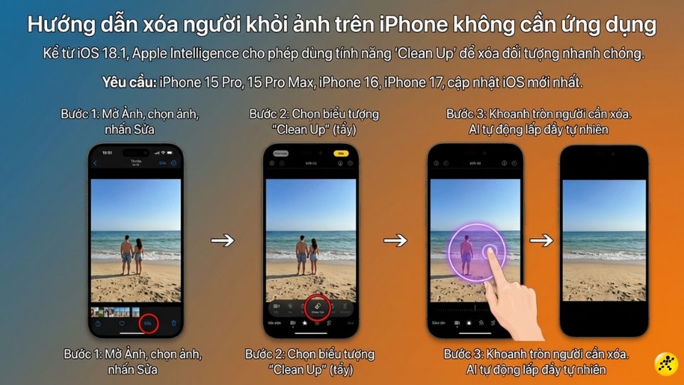 Kể từ phiên bản iOS 18.1, Apple đã tích hợp sâu trí tuệ nhân tạo Apple Intelligence để hỗ trợ người dùng xóa vật thể. Tính năng Clean Up (Dọn dẹp) cho phép xử lý ảnh nhanh chóng mà không cần cài đặt thêm ứng dụng bên thứ ba. Lưu ý, tính năng này hiện hỗ trợ các dòng iPhone 15 Pro, 15 Pro Max và các đời iPhone 16 trở lên.