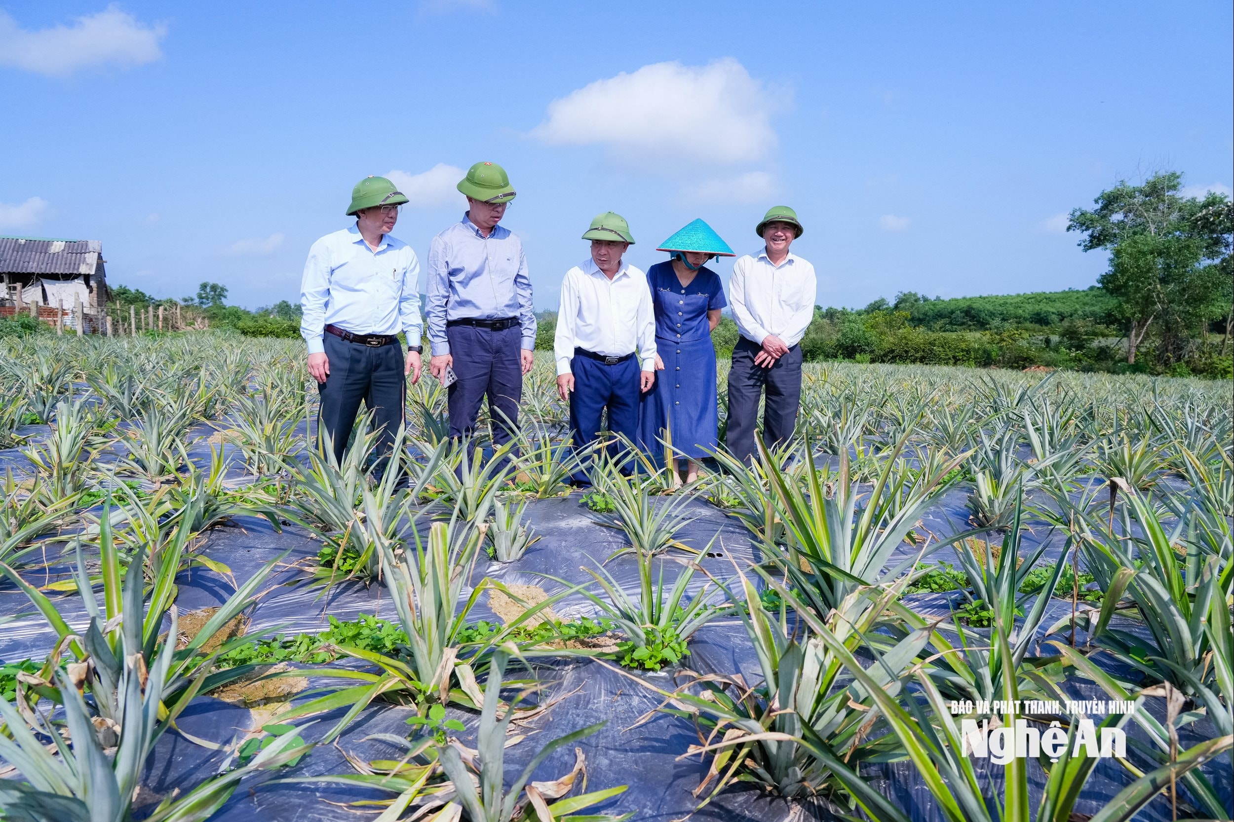 Phó Chủ tịch UBND tỉnh Nguyễn Văn Đệ kiểm tra diện tích trồng dứa nguyên liệu tại xã Đại Đồng. Ảnh: Thanh Lê