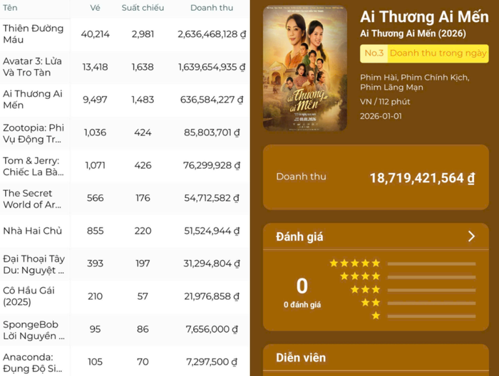 Thế nhưng, khi ra rạp, câu chuyện lại rẽ sang hướng khác. Sau hơn một tuần công chiếu, Ai Thương Ai Mến chỉ thu về khoảng 18 - 19 tỷ đồng, một con số không quá thấp nếu đặt trong mặt bằng chung phim Việt, nhưng lại quá khiêm tốn nếu so với mức đầu tư, kỳ vọng và đặc biệt là cái bóng 211 tỷ của Nụ Hôn Bạc Tỷ. Trong cùng thời điểm, phim phải chia sẻ thị phần với bom tấn ngoại Avatar 3 và đối thủ nội địa Thiên đường máu, tác phẩm đánh thẳng vào đề tài thời sự, giật gân, tạo FOMO mạnh mẽ và chiếm ưu thế tuyệt đối về suất chiếu. Khi rạp buộc phải ưu tiên những bộ phim bán vé tốt, Ai Thương Ai Mến nhanh chóng rơi vào thế bị ép suất, càng khiến hành trình doanh thu thêm chật vật.