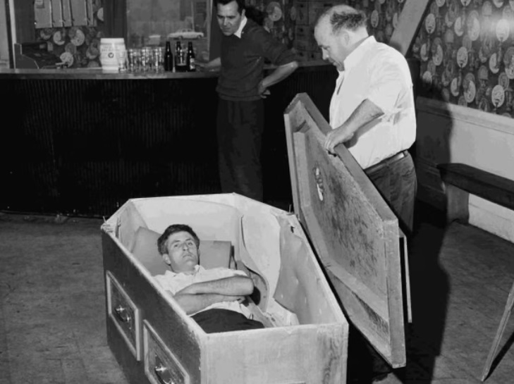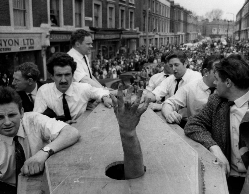 Mick Meaney giơ bàn tay qua chiếc lỗ trên quan tài khi di chuyển trên đường phố ở London năm 1968. Ảnh: Getty Images