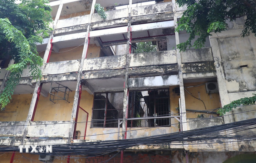 Một góc chung cư Vĩnh Hội (phường Vĩnh Hội) bao gồm lô A, B, C được xây dựng từ trước 1975 được xác định tình trạng cấp D - nguy hiểm bởi tình trạng xuống cấp nặng. (Ảnh: Thanh Vũ/TTXVN)