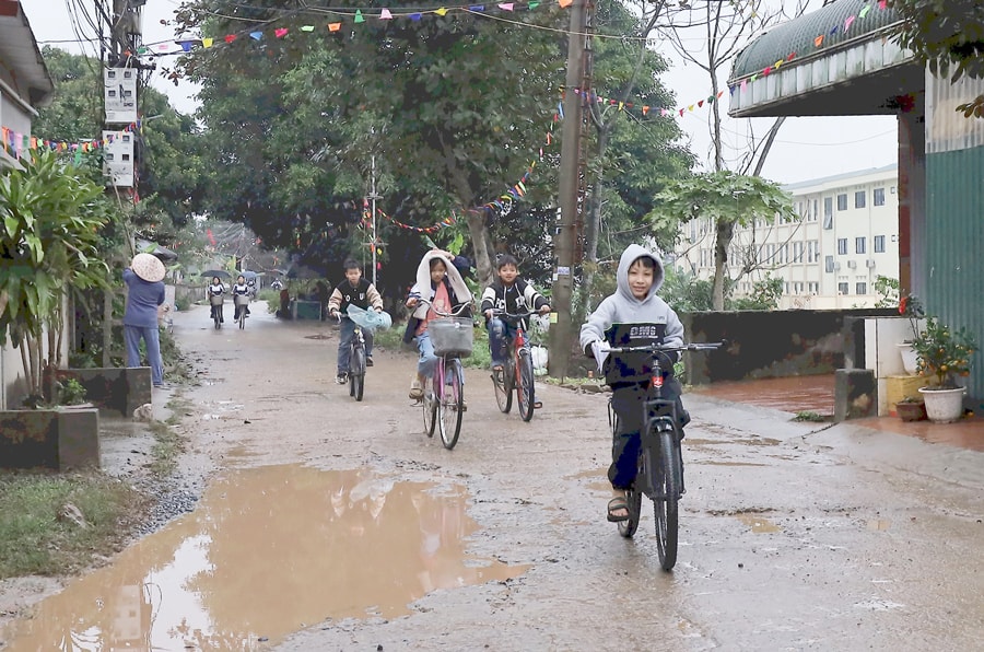 Trong những ngày đông cuối tháng 12-2025, việc lưu thông trên tuyến đê hữu Đáy qua xã Hòa Phú đặc biệt khó khăn. Nhiều người dân phải chật vật tránh ổ gà, ổ voi. Không ít học sinh đến trường trong tình trạng quần áo lấm lem bùn đất. Việc đi lại hết sức vất vả.