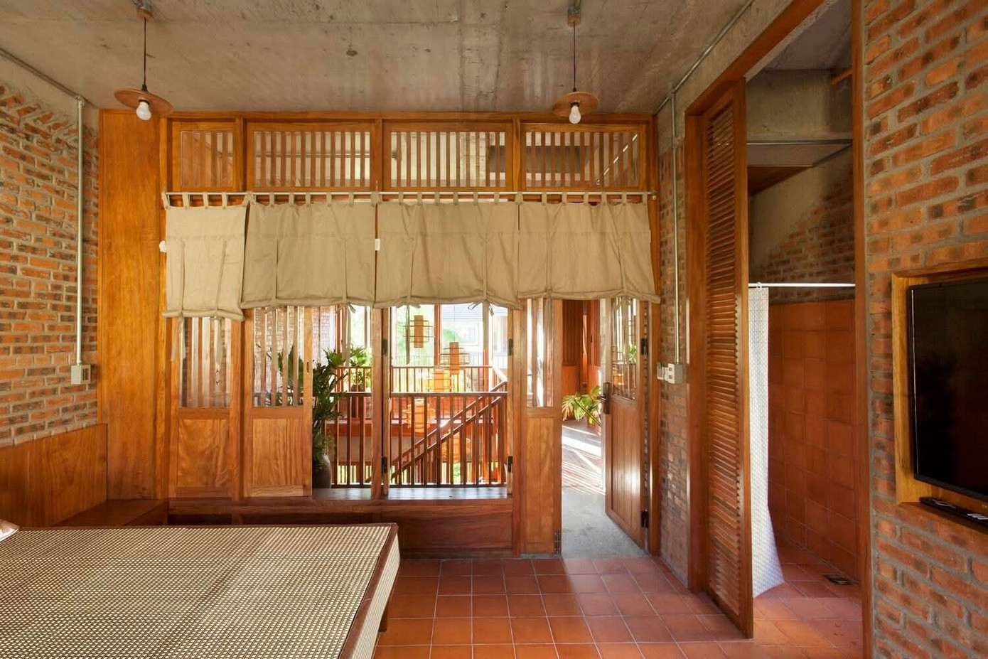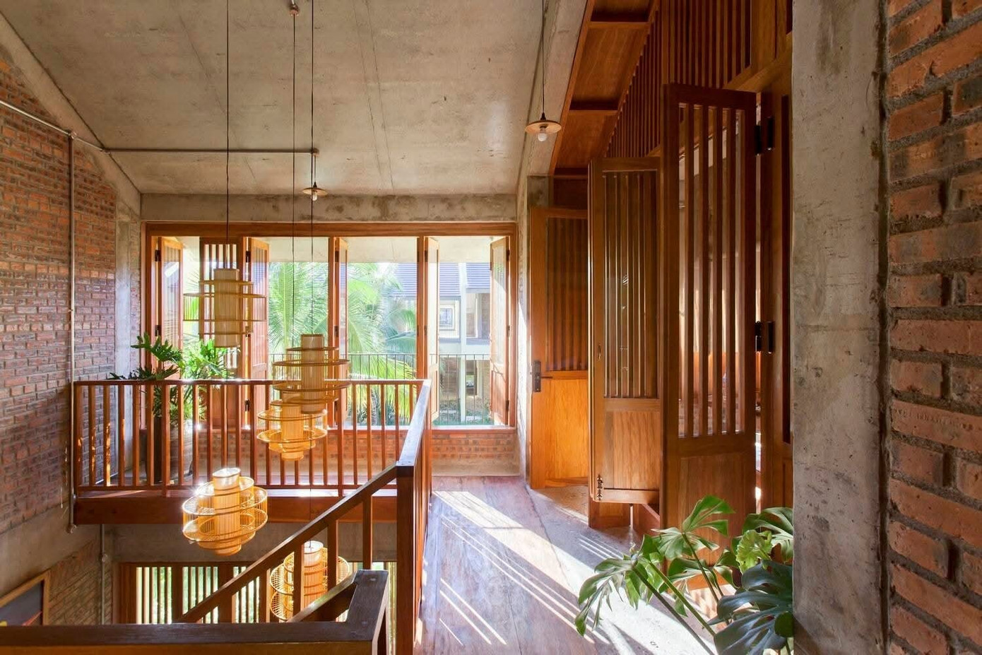 Toàn bộ không gian từ tầng 1 lên tầng 2 đều thoáng mở và được bao trùm bằng ánh sáng tự nhiên và chất cảm mộc mạc của tường gạch, gỗ và vải mộc.