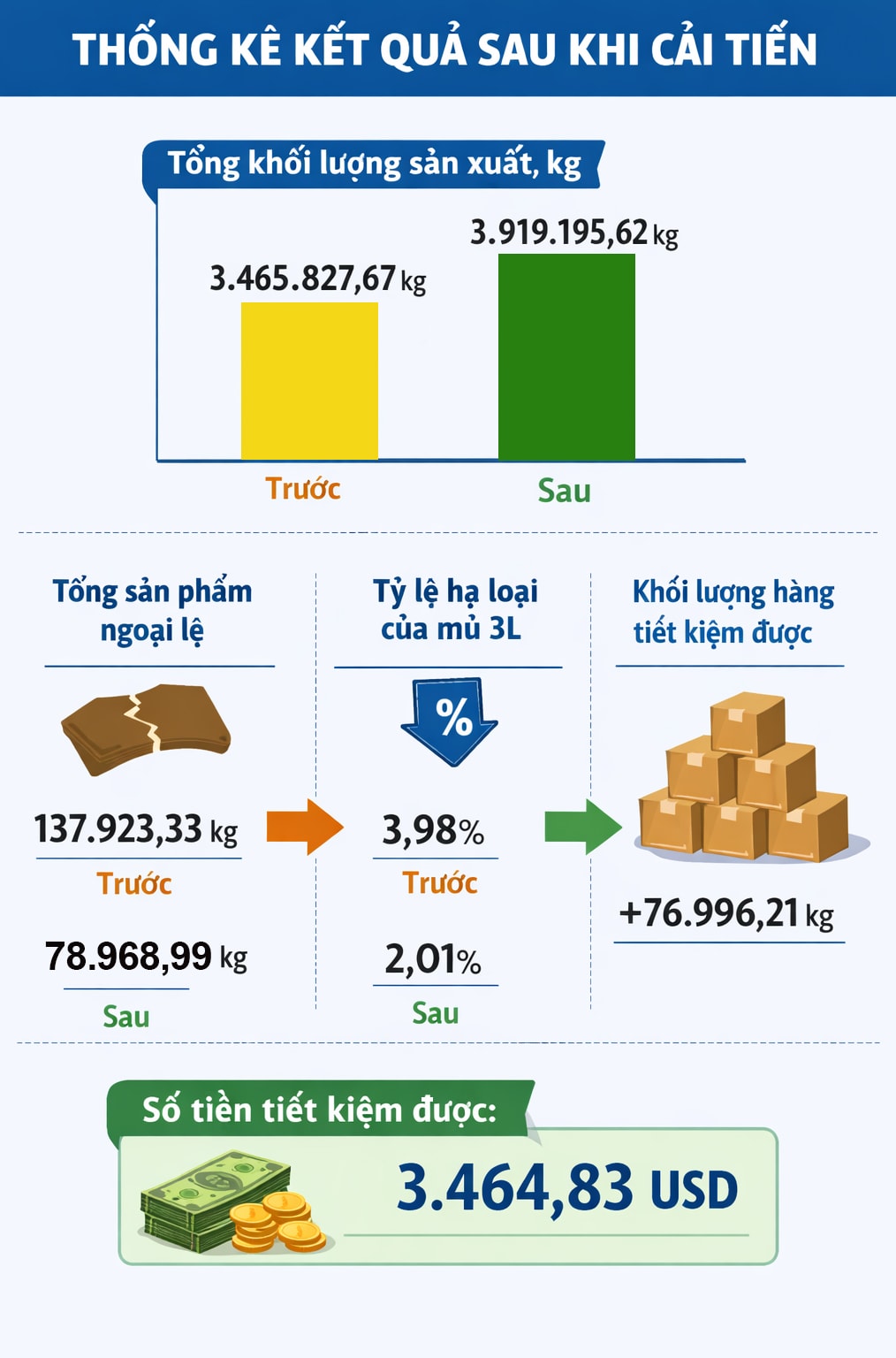 Song song đó, hoạt động Kaizen được áp dụng nhằm giảm tỷ lệ sản phẩm lỗi. Qua phân tích dữ liệu, doanh nghiệp xác định tỷ lệ hạ loại ở mức 3,98% và tiến hành cải tiến tại xưởng chế biến mủ 3L. Sau 5 tháng, tỷ lệ này giảm xuống còn 2,01%. Với sản lượng hơn 3,4 triệu kg/năm, công ty giảm gần 77.000 kg sản phẩm lỗi, tiết kiệm hơn 3.400 USD.