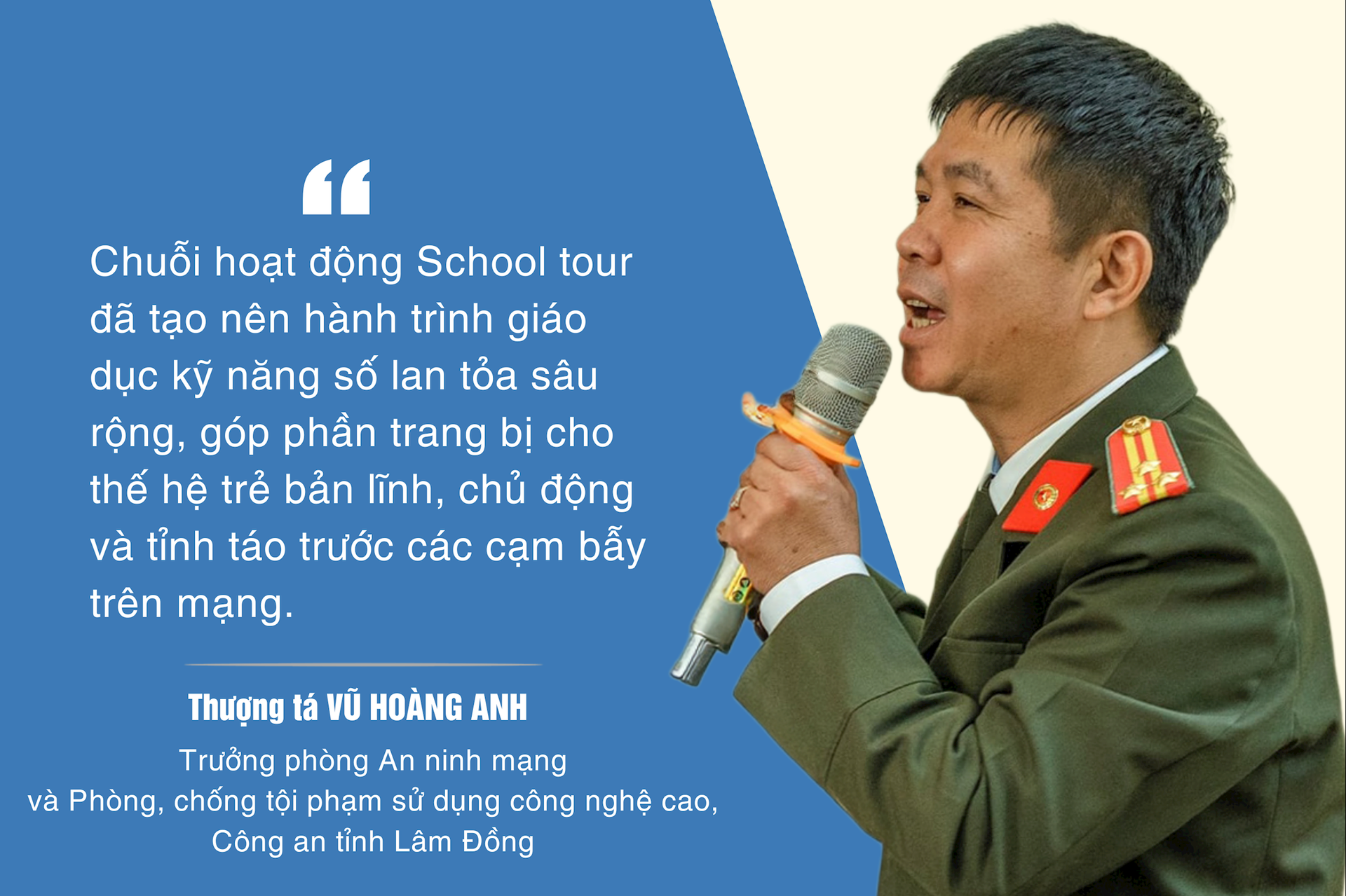 Thượng tá Vũ Hoàng Anh, Trưởng Phòng An ninh mạng và Phòng, chống tội phạm sử dụng công nghệ cao, Công an tỉnh Lâm Đồng chia sẻ: Thành công của chương trình cho thấy hiệu quả của hướng tiếp cận lấy người học làm trung tâm, kết hợp tuyên truyền với thực hành, gắn kết nhà trường – gia đình – xã hội và phát huy vai trò nòng cốt của lực lượng công an cơ sở trong công tác phòng ngừa.