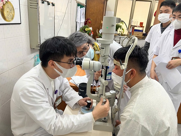 Các bác sĩ Bệnh viện Mắt Trung ương thăm khám cho bệnh nhân bị pháo nổ văng vào mắt.