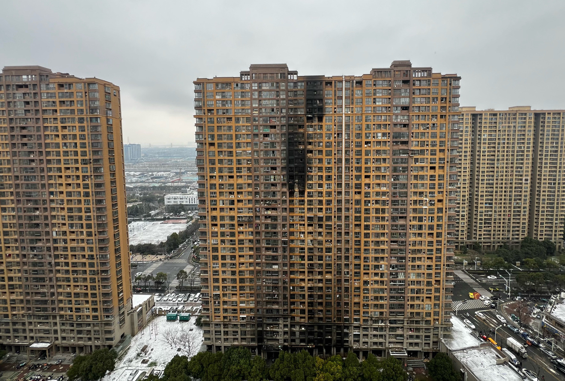 Vụ hỏa hoạn thiêu rụi một tòa chung cư tại thành phố Nam Kinh, Trung Quốc khiến 15 người thiệt mạng sau khi một đám cháy bùng phát ở bãi đậu xe đạp điện tầng trệt vào tháng 2/2024. Ảnh: CaiXinGlobal