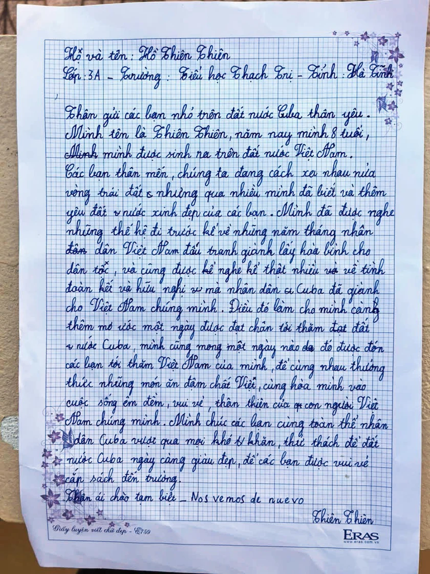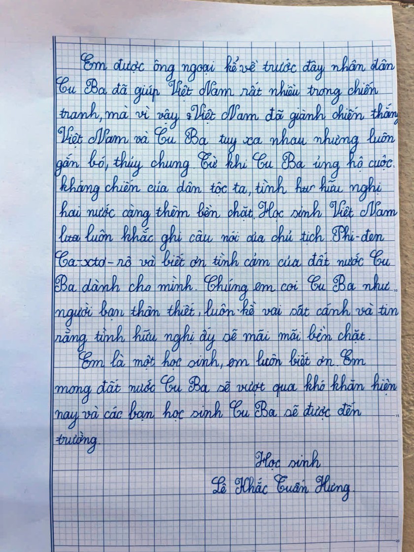 Nhiều bức thư thể hiện ước mong nhân dân Cuba sớm vượt qua khó khăn, các bạn nhỏ Cuba luôn mạnh khỏe, vui tươi và được đến trường như các bạn nhỏ Việt Nam.