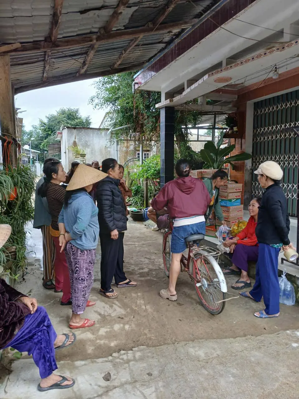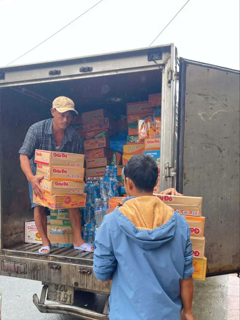“Sáng dậy, anh mượn đâu ra chiếc xe bò lủng lốp, gom hàng chục thùng mì tôm, lấy xe đạp điện kéo đến. Rồi xe đạp điện cũng hỏng, anh dầm mưa đi bộ kéo xe bò gần 10 km, đem hàng đến mà thương vô cùng. Anh còn bỏ 100.000 đồng tiền túi, mua thêm 10 lốc nước gửi cho bà con” - chị Nhung xúc động.