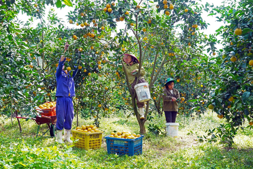 Người dân thu hoạch cam Thượng Lộc. (Ảnh: Hữu Quyết/TTXVN)