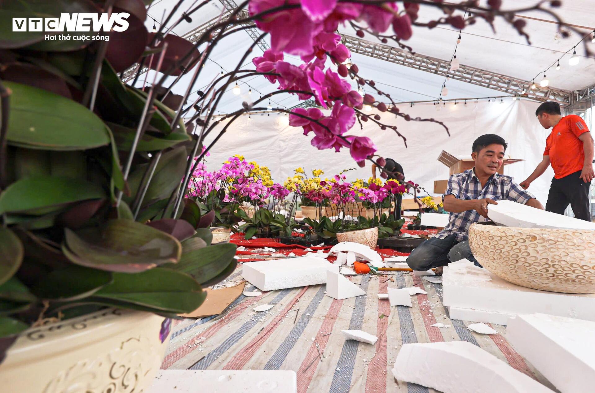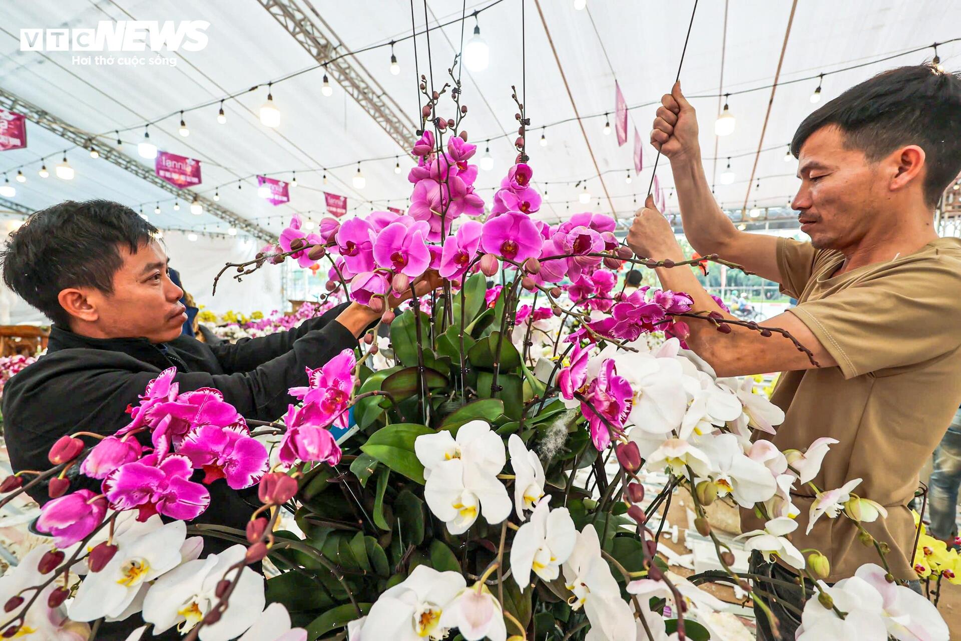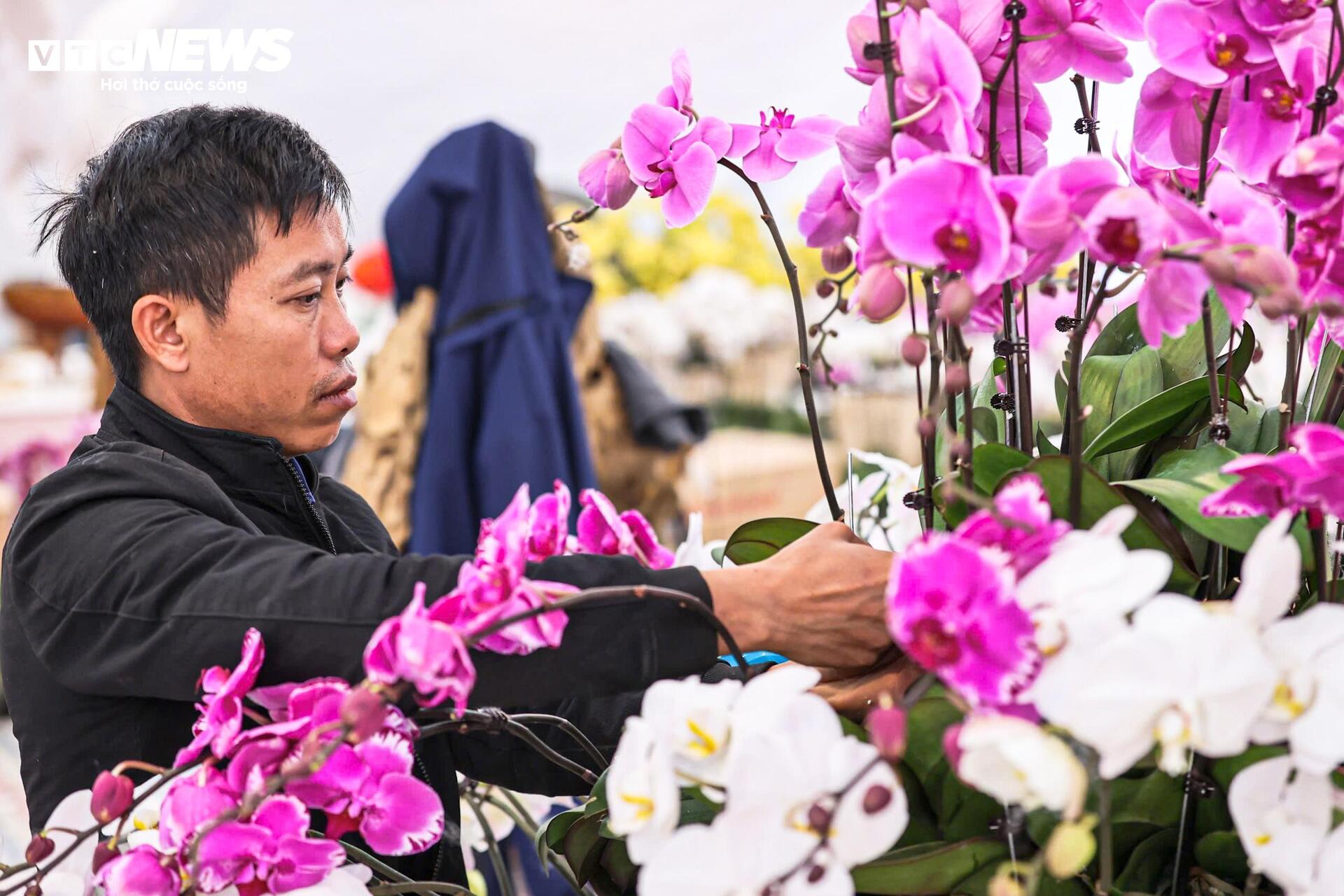 Anh Lâm (quê ở Lào Cai), một thợ cắm hoa lan có nhiều năm kinh nghiệm, cho biết nhóm thợ thường được chia thành hai tổ. “Một tổ chuyên cắm và tạo dáng chậu lan, tổ còn lại phụ trách dựng hoa, di chuyển và các công việc hỗ trợ. Mỗi người một việc để kịp tiến độ vì lượng đơn hàng dịp này tăng nhanh”, anh Lâm nói.