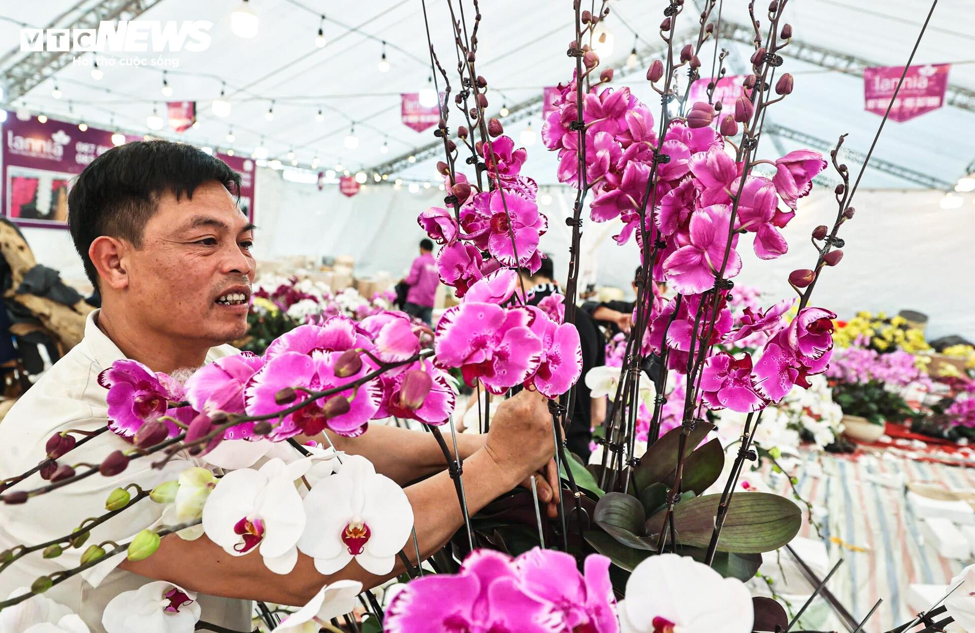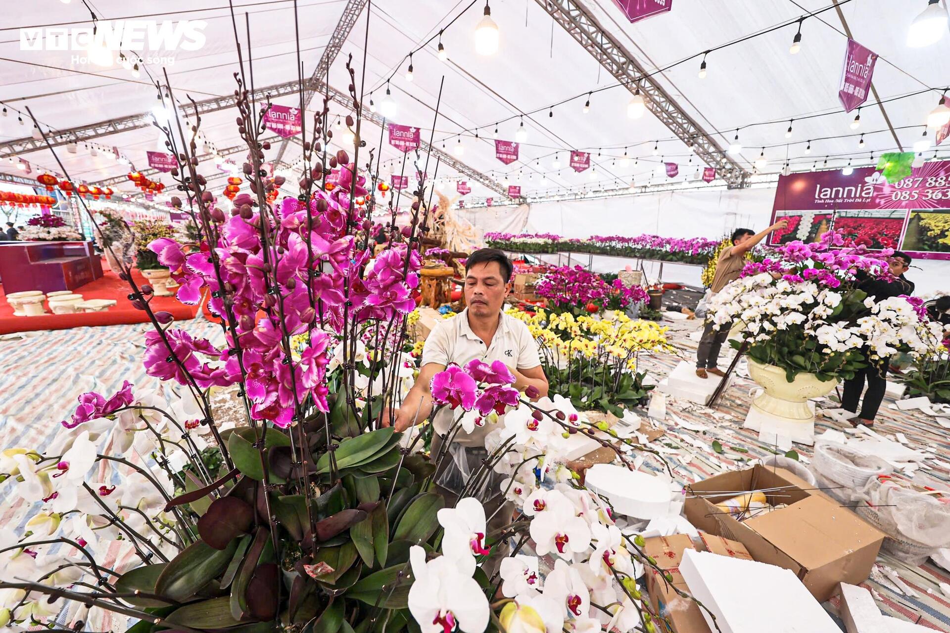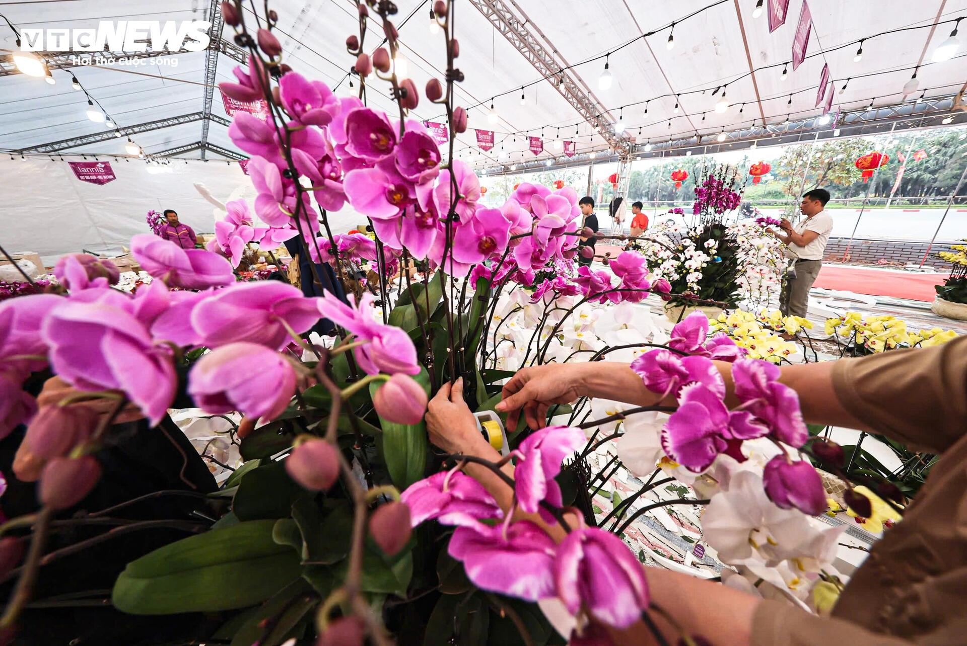 Anh Lâm (quê ở Lào Cai), một thợ cắm hoa lan có nhiều năm kinh nghiệm, cho biết nhóm thợ thường được chia thành hai tổ. “Một tổ chuyên cắm và tạo dáng chậu lan, tổ còn lại phụ trách dựng hoa, di chuyển và các công việc hỗ trợ. Mỗi người một việc để kịp tiến độ vì lượng đơn hàng dịp này tăng nhanh”, anh Lâm nói.