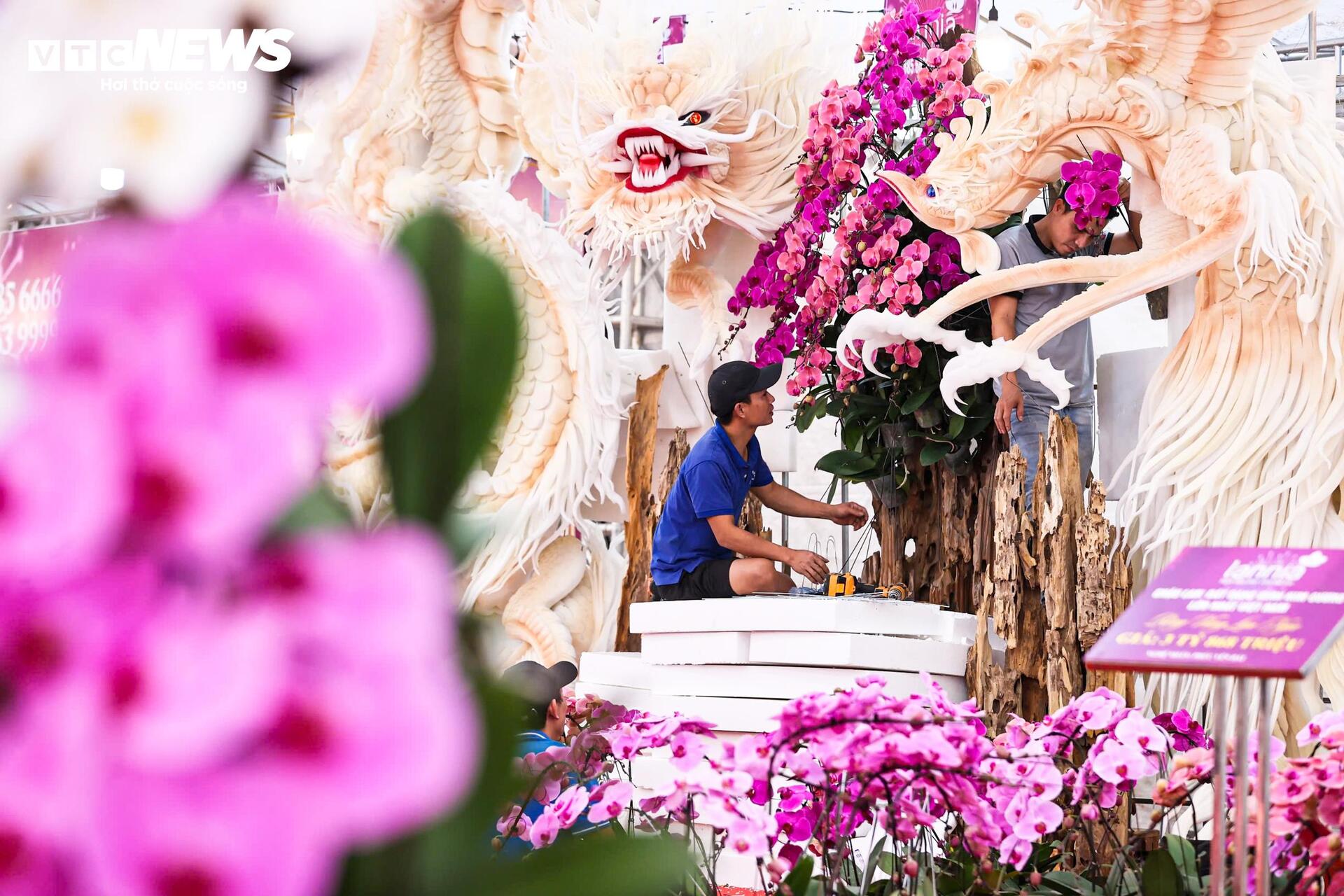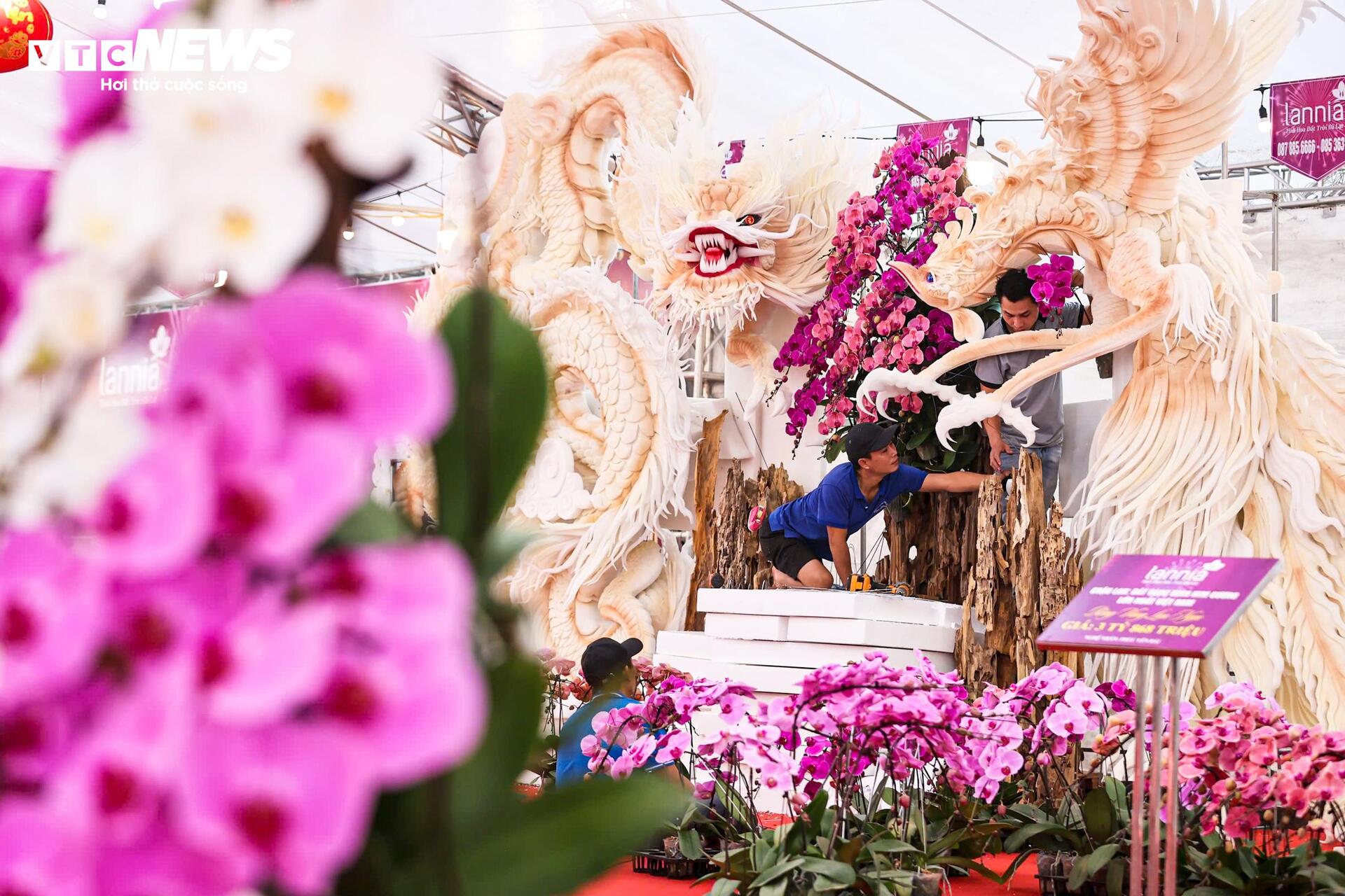 Đáng chú ý, một số cửa hàng còn thiết kế các tác phẩm lan nghệ thuật quy mô lớn, kết hợp hoa lan với lũa và các vật liệu trang trí. Một tác phẩm mang tên “Long phụng sum vầy” đang được nhóm thợ hoàn thiện, đòi hỏi nhiều công đoạn từ tạo khung, cắm hoa đến chỉnh sửa chi tiết.