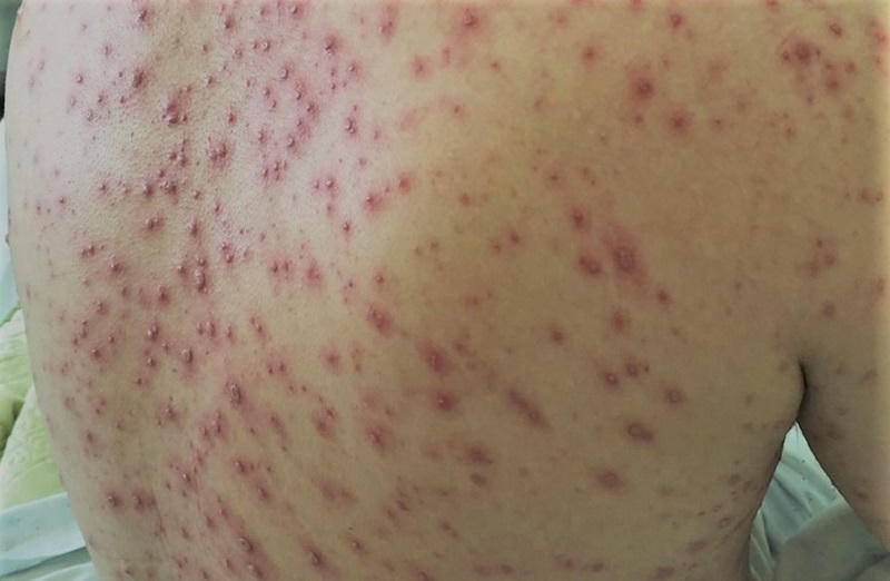 Khi nhập viện, bệnh diễn biến nặng hơn với biểu hiện da toàn thân nổi dày các sẩn đỏ xen lẫn phỏng nước, nhiều nốt đã hóa mủ đục, gây ngứa nhiều và khó chịu, ảnh hưởng nghiêm trọng đến sinh hoạt hàng ngày. Qua thăm khám và đánh giá lâm sàng, các bác sĩ chẩn đoán bệnh nhân mắc thủy đậu bội nhiễm – một biến chứng thường gặp khi tổn thương da không được chăm sóc đúng cách hoặc người bệnh gãi làm vỡ các nốt phỏng nước, tạo điều kiện cho vi khuẩn xâm nhập.