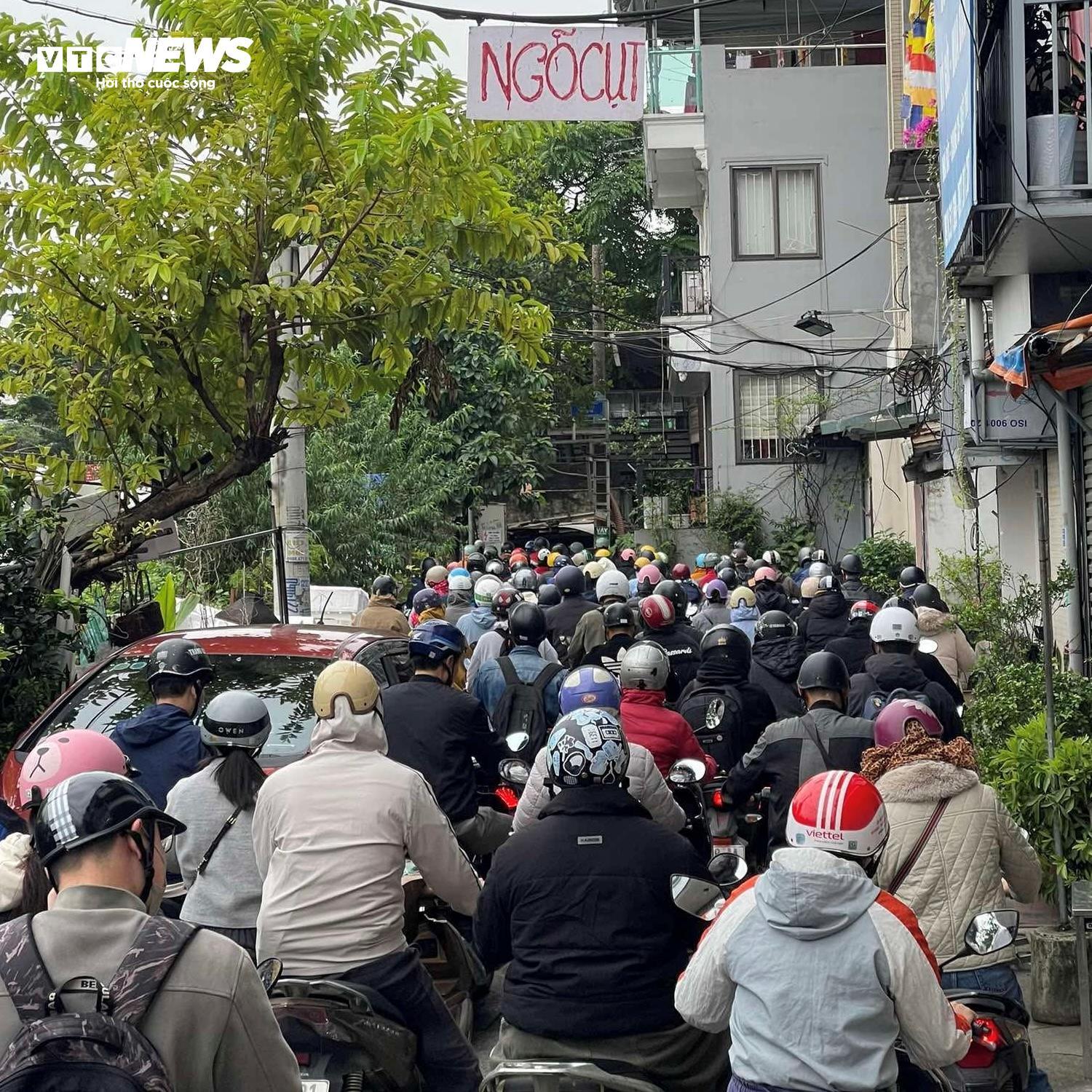 Tại một lối lên khác hướng về cầu Chương Dương, dù người dân đã treo biển “ngõ cụt”, nhưng dòng xe máy vẫn cố tình đi vào, khiến khu vực này rơi vào cảnh tắc không lối thoát.