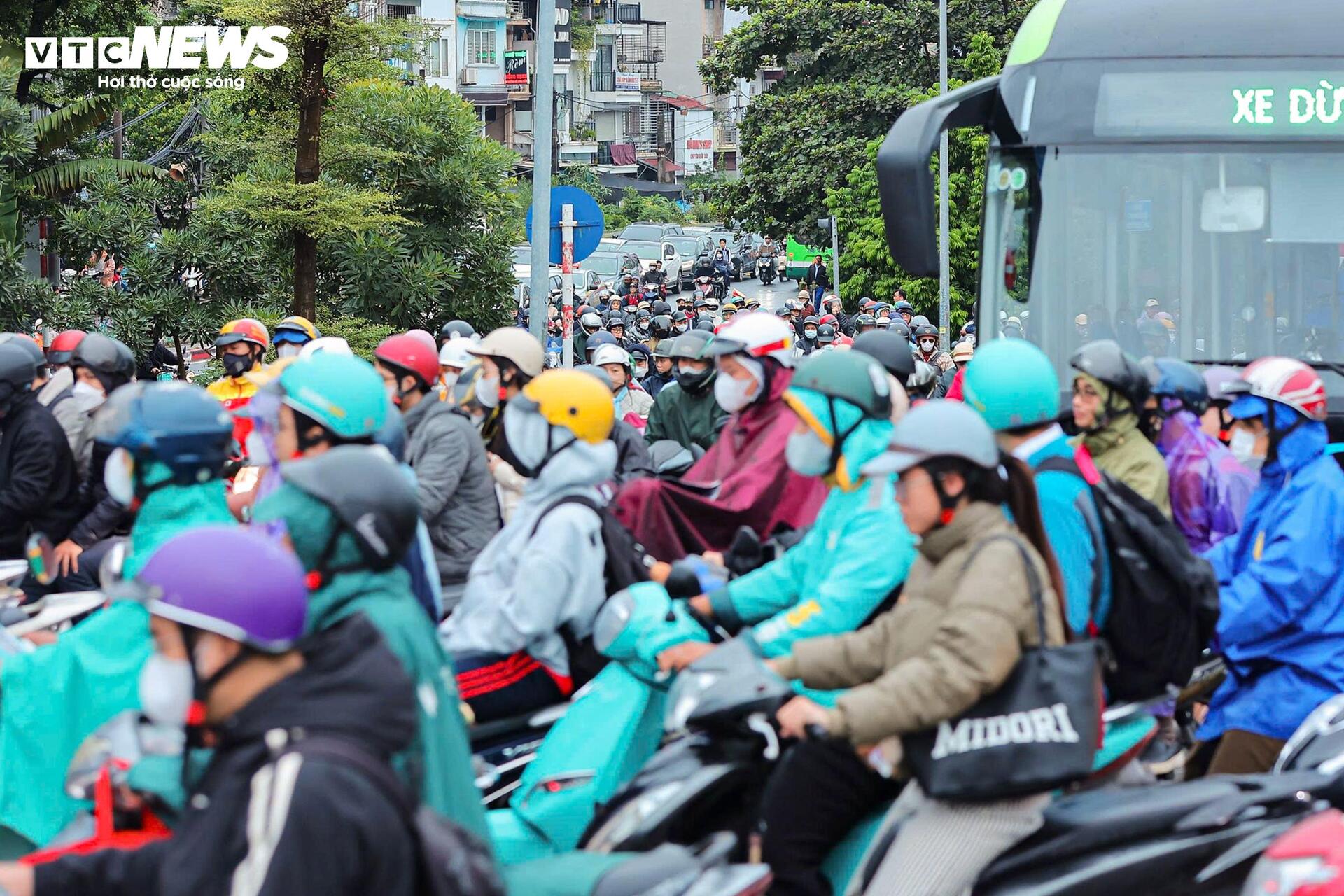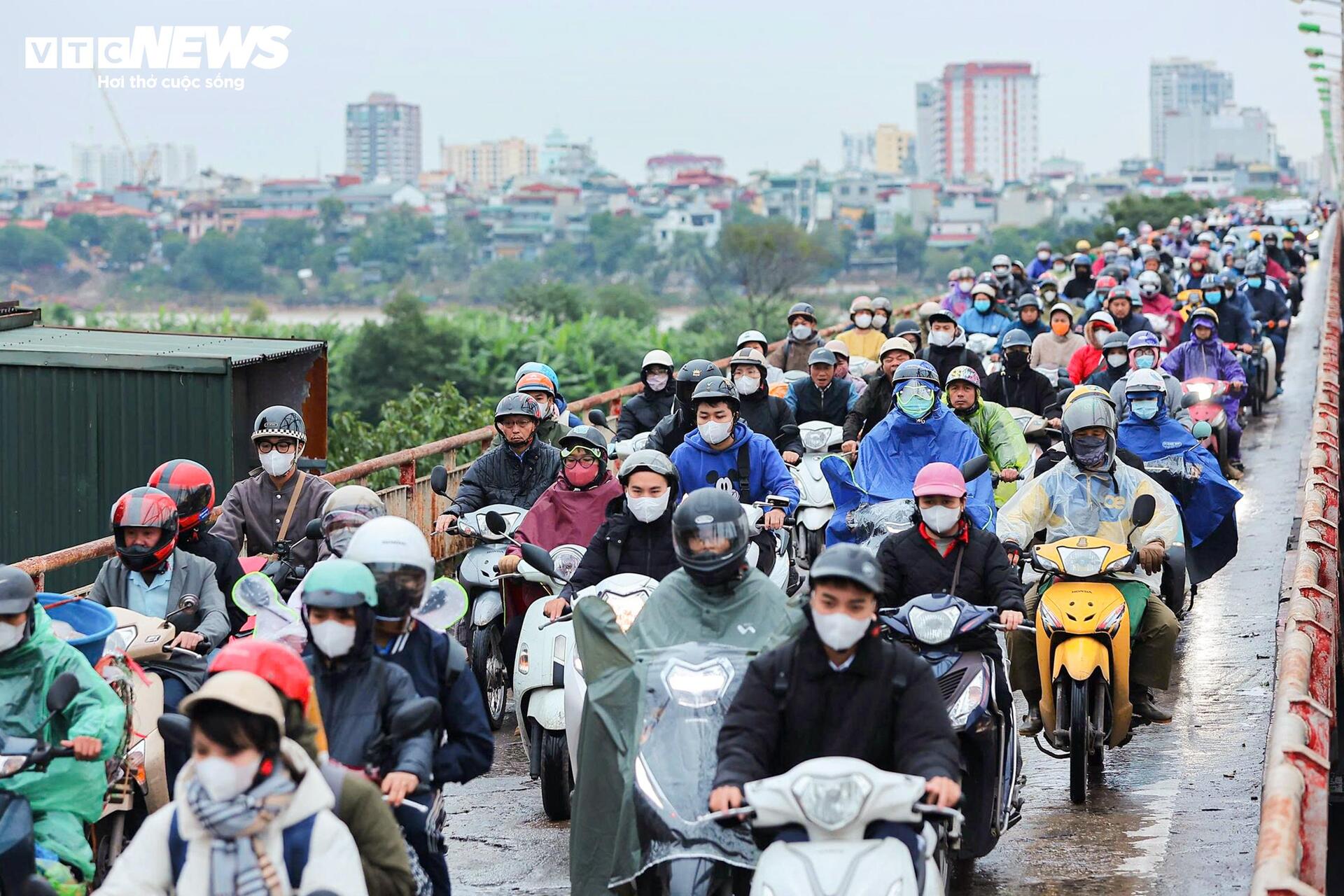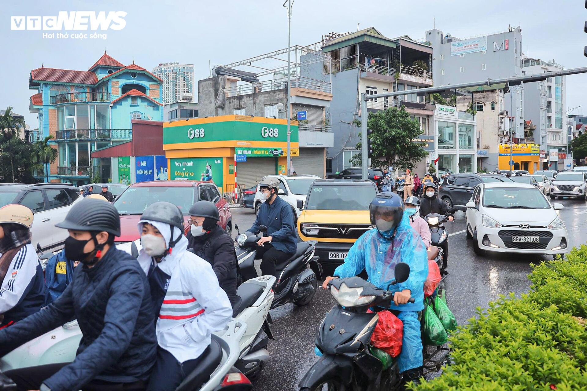 Trời mưa rét, đường đông nghẹt khiến người dân chật vật di chuyển trong giờ cao điểm buổi sáng.