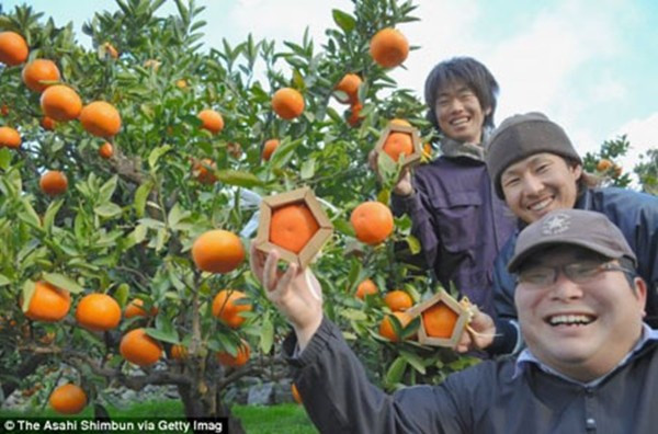 Nông dân cẩn thận bọc từng quả cam vào khuôn để khi quả lớn lên sẽ tạo thành các cạnh nhọn. Ảnh: Getty